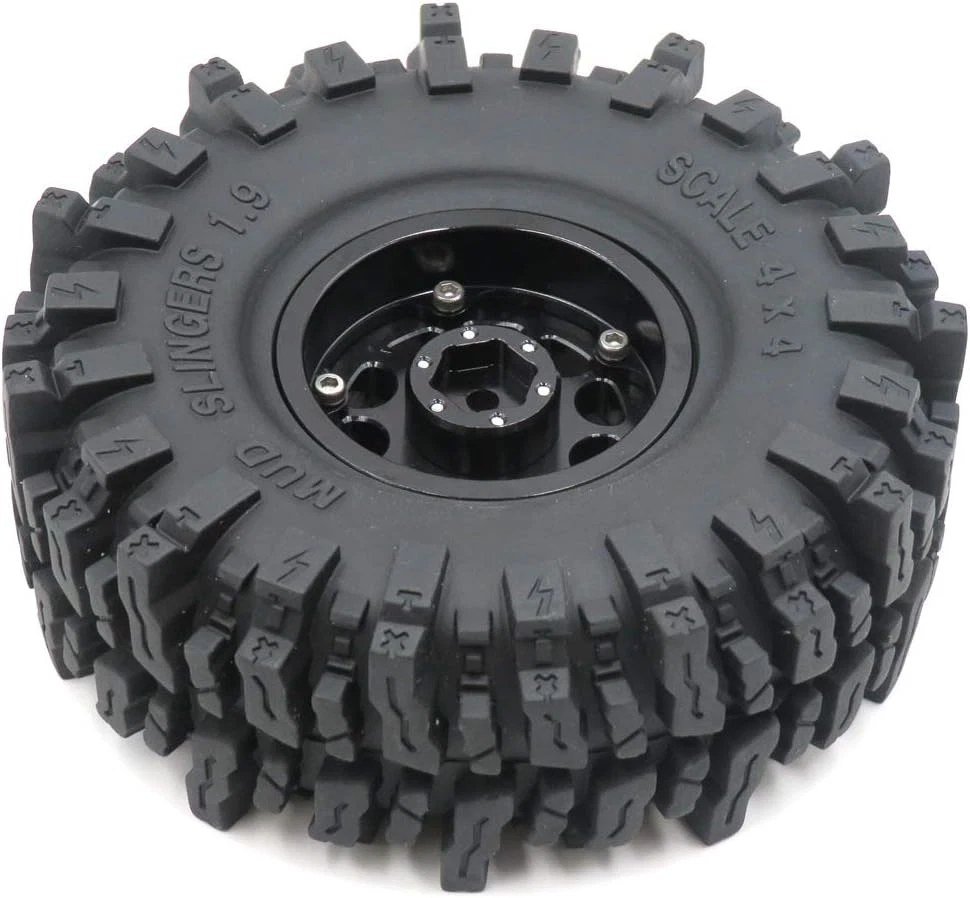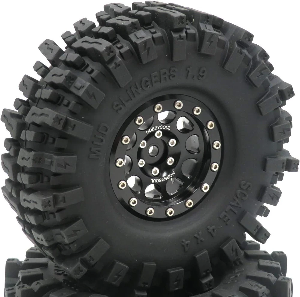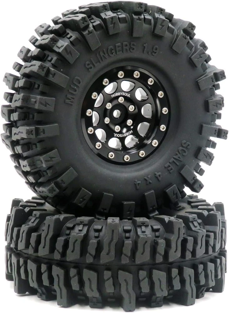 Made in the HOBBYSOUL Soft Sticky Compound tire with aluminum Wheel ( These tires better than common rubber that is good heat resistance and good cold resistance, high wear resistance and excellent durability. Sticky Soft compound delivers maximum gripping power for loose conditions - dry and loamy, or wet and muddy and rock Crawling, Design for professional RC crawler. ) 4pcs 1.9 Mud Slingers Tires + 4pcs 1.9 Aluminum Beadlock Wheels (Pre Assembled) Fit for Traxxas TRX4 / RC4WD D90 D110 TF2 / Tamiay CC01 / Axial SCX10 90047 SCX10 III AXI03007 / Redcat Gen8...... Tire diameter: about 120mm (4.72inch) / Tire Width: About 43mm (1.69inch) / Wheel hex: 12mm Total Weight: about 180g/pc (1pc beadlock wheel + 1pc tire with foam) If just need 1.9 mud slingers tires, please purchase the 4pcs tires ASIN: B08B42PVV9 or 5pcs tires ASIN: B08LGWLSQJ . Product Description TIRE HEIGHT & WIDTH Tires Height: 4.72'' (120mm) is perfect for scale crawlers that want maximum ground clearance and unmatched rock crawling performance, giving you the height you need to tackle any obstacles and give you the optimum in handling;Tires Width: 1.69'' (43mm) is super grip and suitable for a variety of terrains TIRE TREAD PATTERN These RC 1.9 tires have larger tread delivers maximum gripping power for loose conditions ( fit for dry / loamy / wet / muddy / Rock crawling / Swampers / Badland Terrain), the SOFT COMPOUND and LARGER LUGS, DEEPER VOIDS TREADS and SIDE CLEATS enhanced the performance in mud and rock crawling. TIRE MATERIAL HOBBYSOUL Soft Compound Tire (with foam insert), good heat resistance and good cold resistance, give you the optimum in handling, durability and longevity. WHEEL Aluminum 1.9 Beadlock wheel consists of 5 parts, easy to remove and change the tires; Aluminum anodic oxidation sleek surface, longevity and beautiful appearance. MULTI-TERRAIN