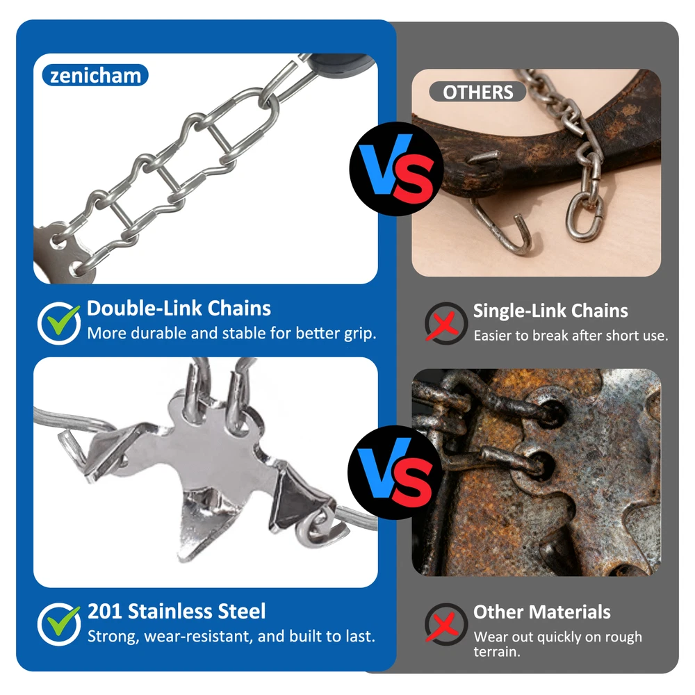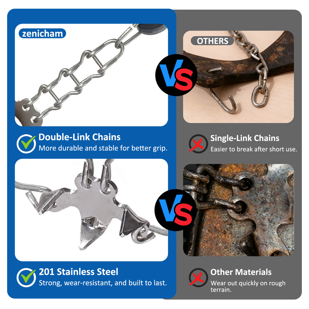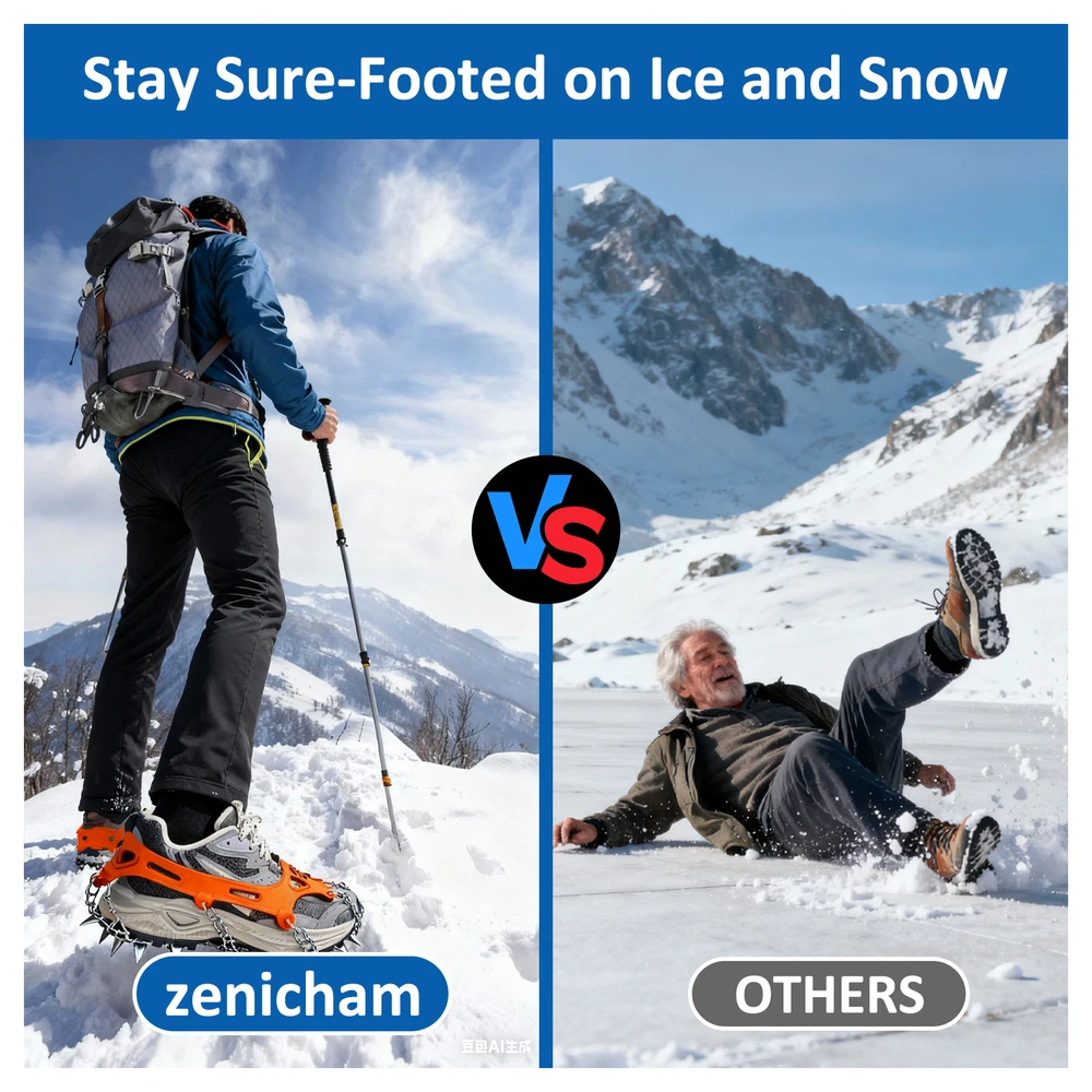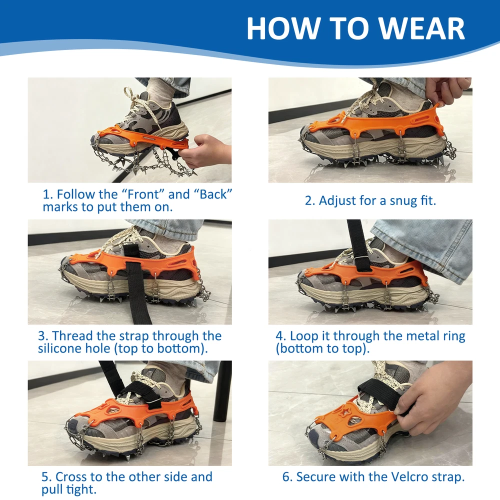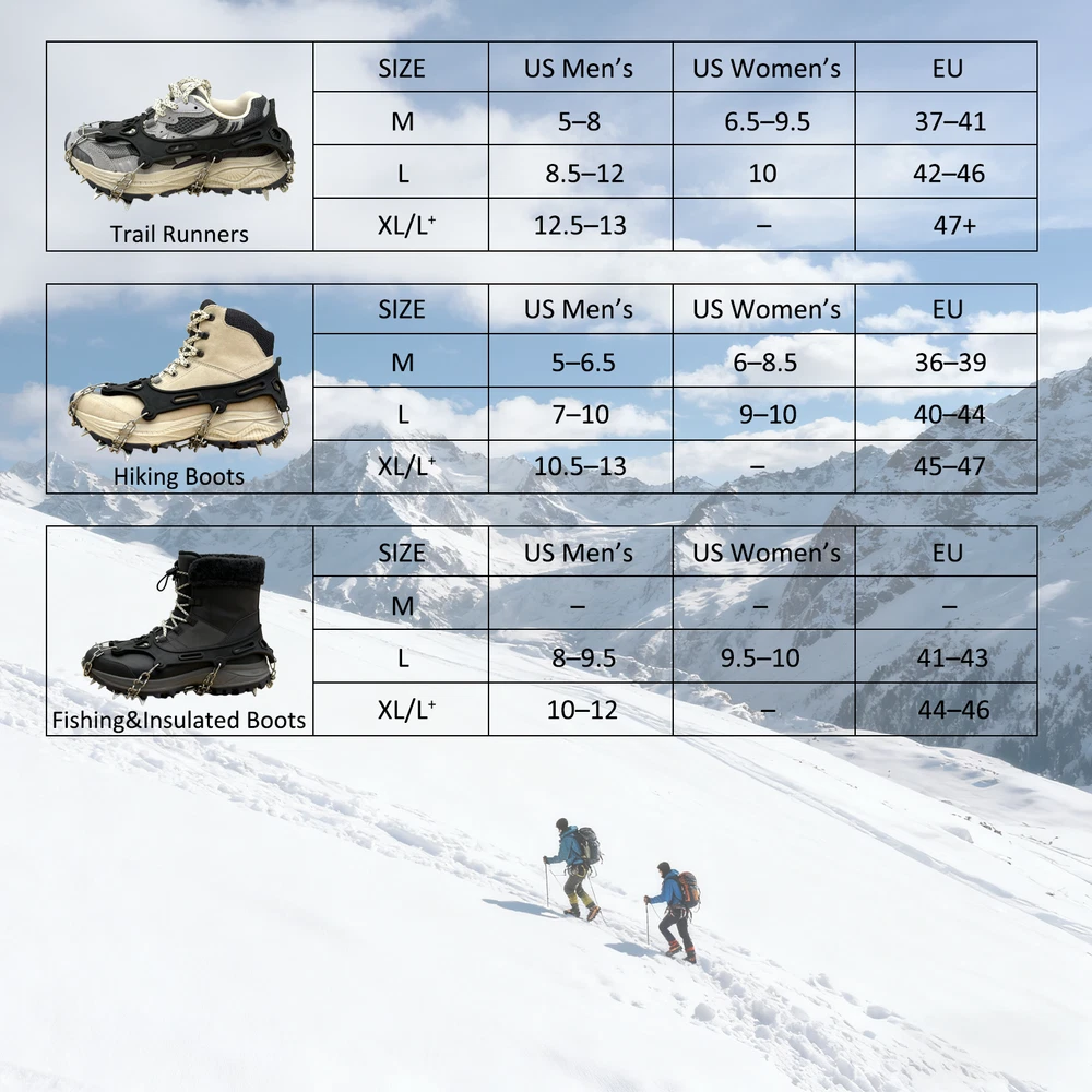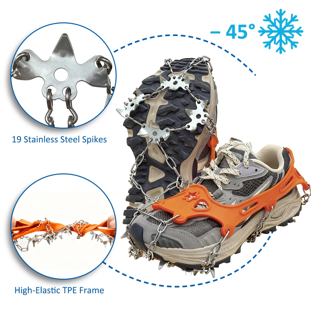 【SUPERIOR TRACTION WITH 19 SPIKES】Equipped with 19 premium manganese steel spikes and durable 201 stainless steel chains, these ice cleats and crampons provide superior grip and stability on snow, ice, mud, and rocky terrain—reducing slips and falls for safer adventures 【DURABLE & SAFE MATERIAL】The TPE harness endures -49°F (-45°C) with exceptional elasticity and tear resistance. It offers a secure, close fit over most shoes and boots—ideal ice cleats for shoes and boots and crampons that ensure long-lasting performance 【ADJUSTABLE & EASY TO WEAR】Features 30cm adjustable hook-and-loop straps for quick fitting and removal. These mens cleats, microspikes for hiking, and crampons stay firmly in place, delivering reliable traction whether climbing hills or running on icy roads 【COMPACT & PORTABLE DESIGN】Lightweight at only 0.5kg, with a 20×23cm carry bag for convenient storage. Remove and store easily without scratching indoor floors—perfect climbing spikes, boot chains, and crampons for travel, work, or everyday use 【MULTI-PURPOSE WINTER GEAR】Ideal for hiking, trekking, shoveling snow, ice fishing, or mountain climbing. These all-terrain crampons, ice cleats, and climbing gear suit teens, adults, and seniors—great gifts for outdoor enthusiasts and winter explorers