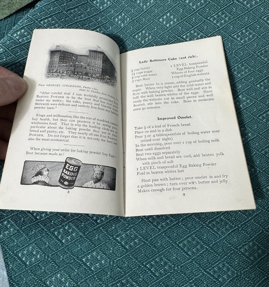 Fantastic recipe booklet put out by the Egg Baking Power Co New York. This recipe booklet is 31 pages with 10 famous hotel illustrations and their recipes. . Beautiful condition with no stains or tears. Booklet is 4” by 6 1/2”. It doesn’t get any better than this!
