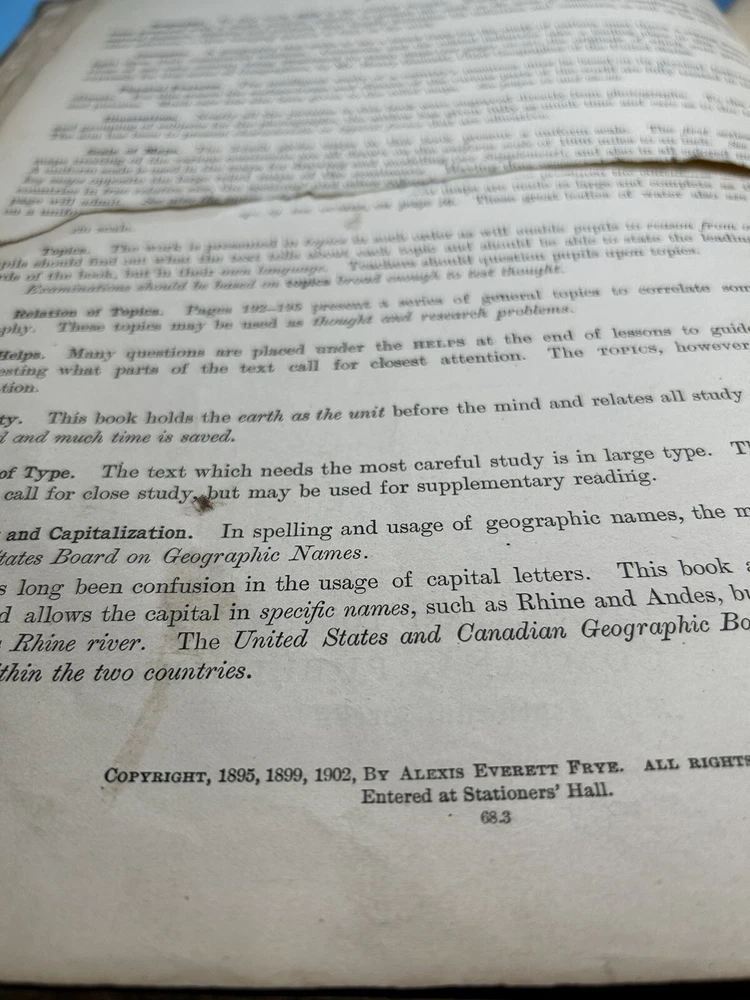1902 Frye’s Grammar School Geography Harcover Book New Jersey Edition Ginn & Co. This is a pre owned item which has various cosmetic blemishes, including signs of wear, tears, markings and imperfections due to its previous use, age, movement, and storage. It should also be noted that color may vary from photos due to camera flash or/and computer monitor color variations. If condition concerns you, please review the images closely before purchasing, zooming in as necessary. Questions are also welcomed. SKU DL/30/3/23
