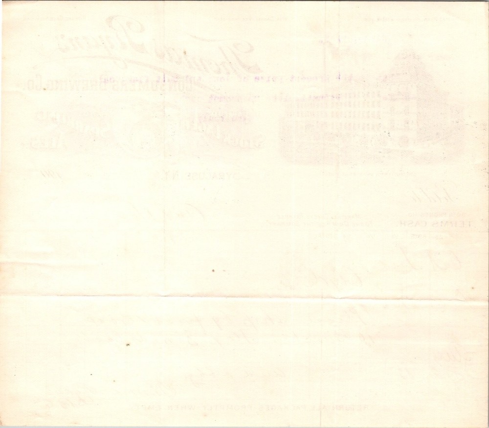 This original 1902 invoice letterhead from Thomas Ryan's Consumers Brewing Co. of Syracuse, New York, offers a fascinating glimpse into early 20th-century American brewing and commerce. The letterhead prominently features an intricate illustration of the brewery building at the corner of Butternut and McBride Streets, along with elegant typography advertising their famous Stock Lager and Sparkling Ales. The document is dated August 1, 1902, and includes handwritten customer instructions for shipment, signed by Thomas Ryan himself. This piece of ephemera reflects the importance of local breweries before Prohibition, showcasing business practices with terms like "Terms Cash" and telephone contact information. Collectors and historians will appreciate the detailed artwork, notable company officers listed, and the connection to Syracuse's brewing history. The item remains intact with visible folds and typical light aging, preserving a tangible link to American industrial and social history.