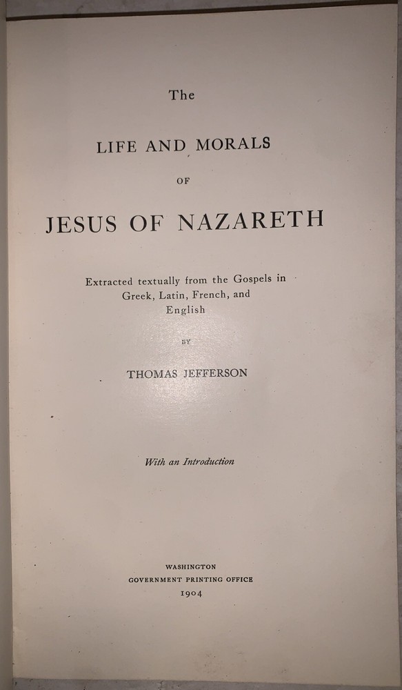 The Life and Morals of Jesus of Nazareth Extracted textually from the Gospel in Greek, Latin, French, and English by Thomas Jefferson With an Introduction Washington: Government Printing Office 1904 First Edition Limited Edition, intended primarily for members of Congress. With an ink stamp that reads "With the Compliments of J. A. Goulden," indicating that this copy was distributed by United States House of Representatives member Joseph Aloysius Goulden of New York. Octavo, 19 pages, followed by a facsimile of the Jefferson Bible. Bound in the original full red leather with ornate gilt decoration to boards and spine. Marbled endpapers. Some rubbing and wear, hinges cracking, discoloration to leather, damage to spine, else in good + condition. The Life and Morals of Jesus of Nazareth, often referred to as the "Jefferson Bible," is a unique work created by Thomas Jefferson around 1820. Compiled for his personal study, Jefferson meticulously cut and pasted passages from the Gospels of Matthew, Mark, Luke, and John to produce a chronological account of Jesus’ teachings and actions, focusing exclusively on his moral philosophy. Omitting miracles, references to divinity, and the Resurrection, Jefferson sought to present Jesus as a moral teacher rather than a divine figure. Originally unpublished during Jefferson’s lifetime, the manuscript was rediscovered by the Smithsonian Institution in 1895 and first published in 1904 by the U.S. Government Printing Office. Initially distributed to members of Congress, the book gained wider recognition over time and remains a significant reflection of Jefferson’s Enlightenment-era skepticism toward organized religion and his admiration for ethical teachings. If you have any questions, feel free to ask, and don't forget to check out my other listings.