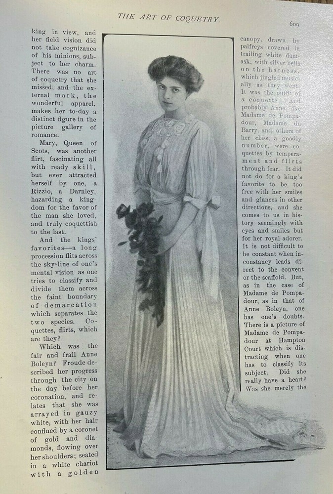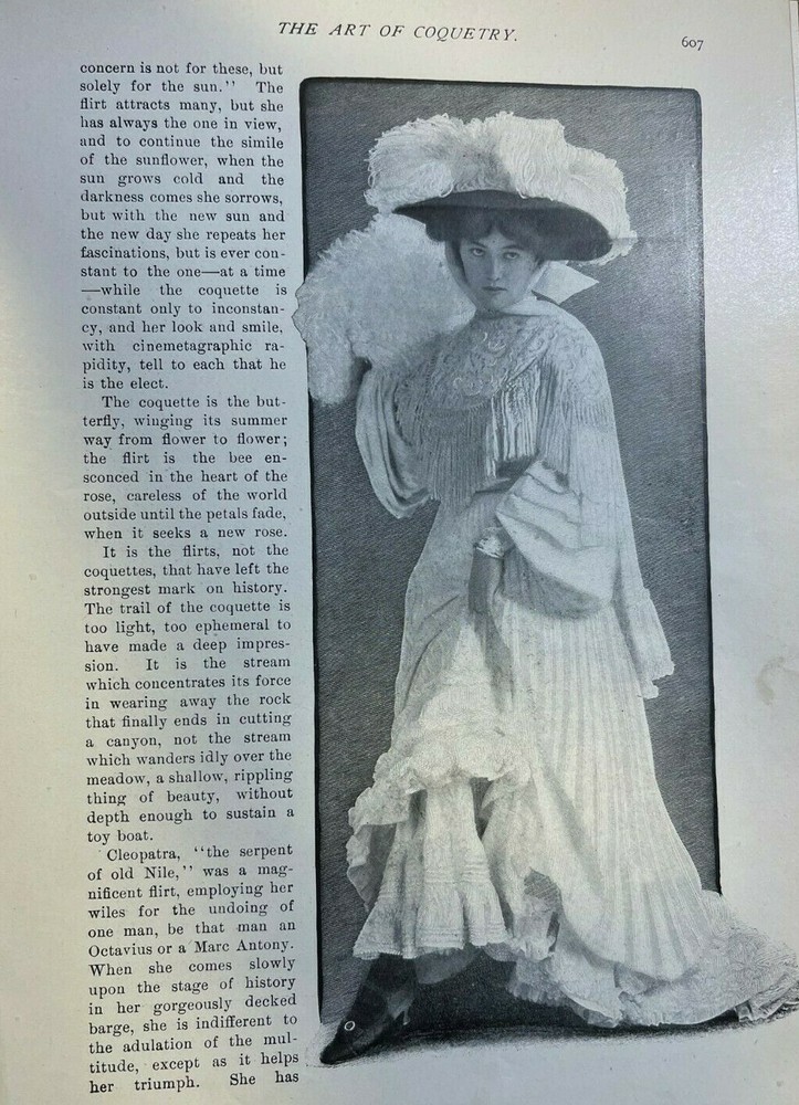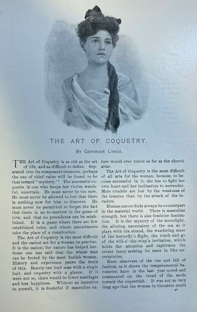 1. This vintage 1904 magazine article is a charming piece of history! The 8 illustrated pages beautifully capture the art of coquetry from the early 20th century—elegant, playful, and full of character. Though it shows some age-related browning and minor wear, the illustrations and text remain clear and delightful. Perfect for framing, scrapbooking, or adding to a vintage paper collection. A truly unique find for lovers of antique fashion and social history. The condition is impressive for being over a century old! Highly recommended for anyone who appreciates timeless style.