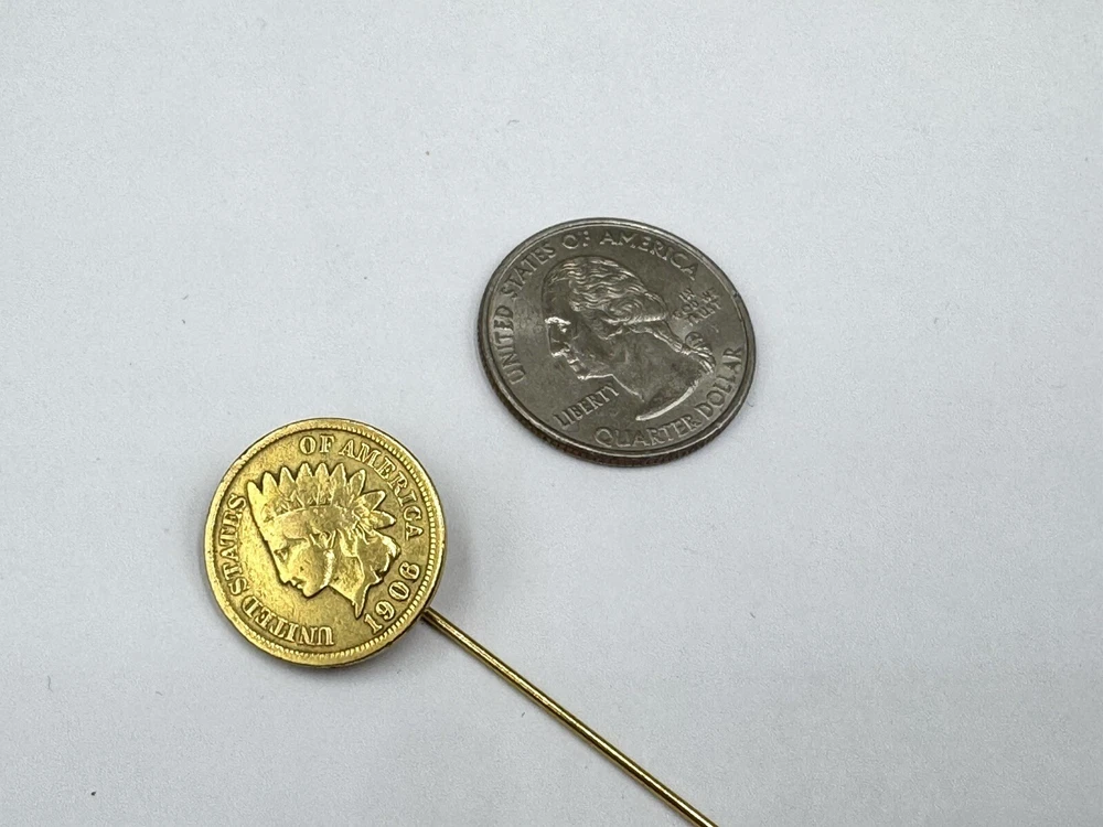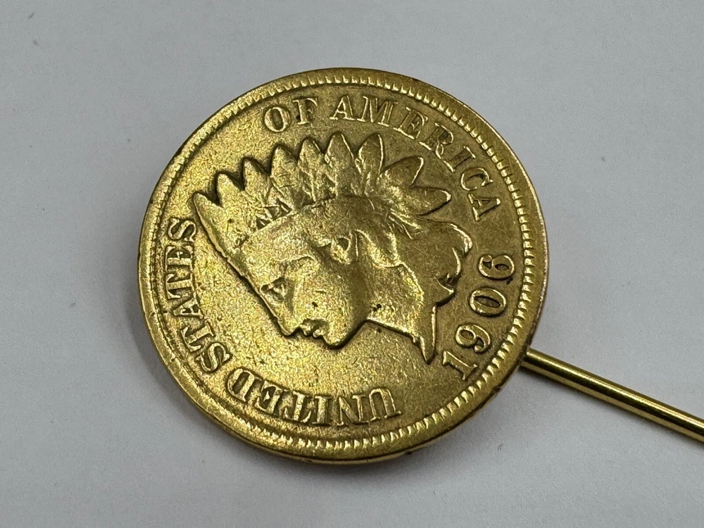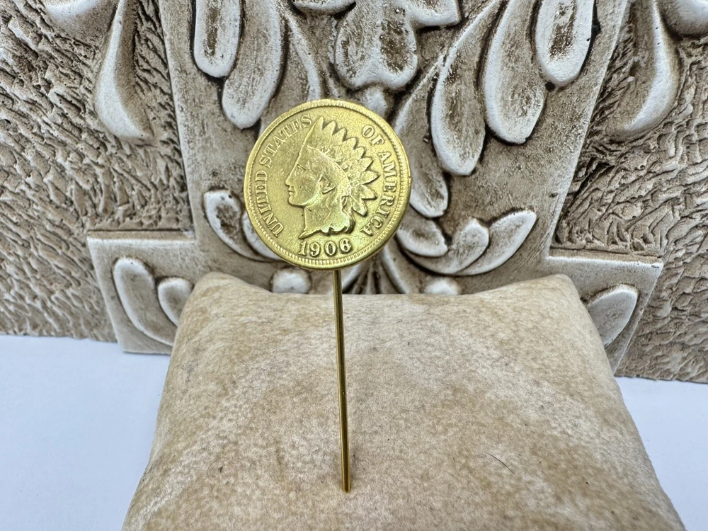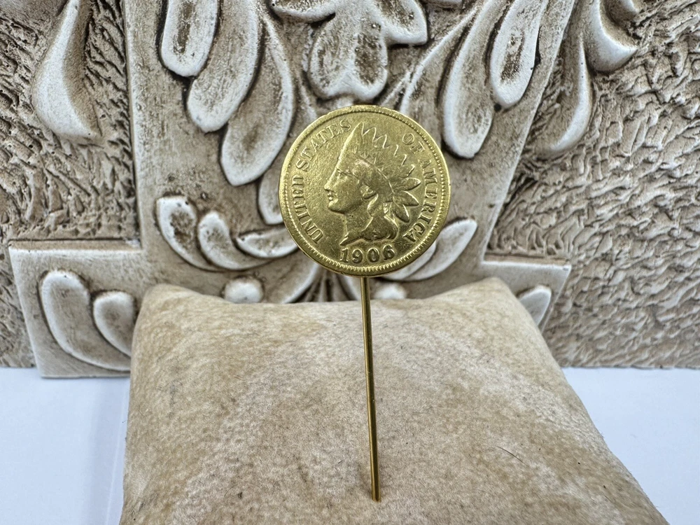 This vintage stick pin features a 1906 Indian Head Cent penny as the centerpiece, set in a round golden metal frame. It is a unique piece of coin jewelry with a classic antique design. The stick pin is suitable for various occasions like engagements, anniversaries, birthdays, and Father's Day. It carries a vintage charm and is ideal for both men and women who appreciate beauty and art in their accessories. Great for a coin collector, just something cute.. In great condition. We do combine shipping.