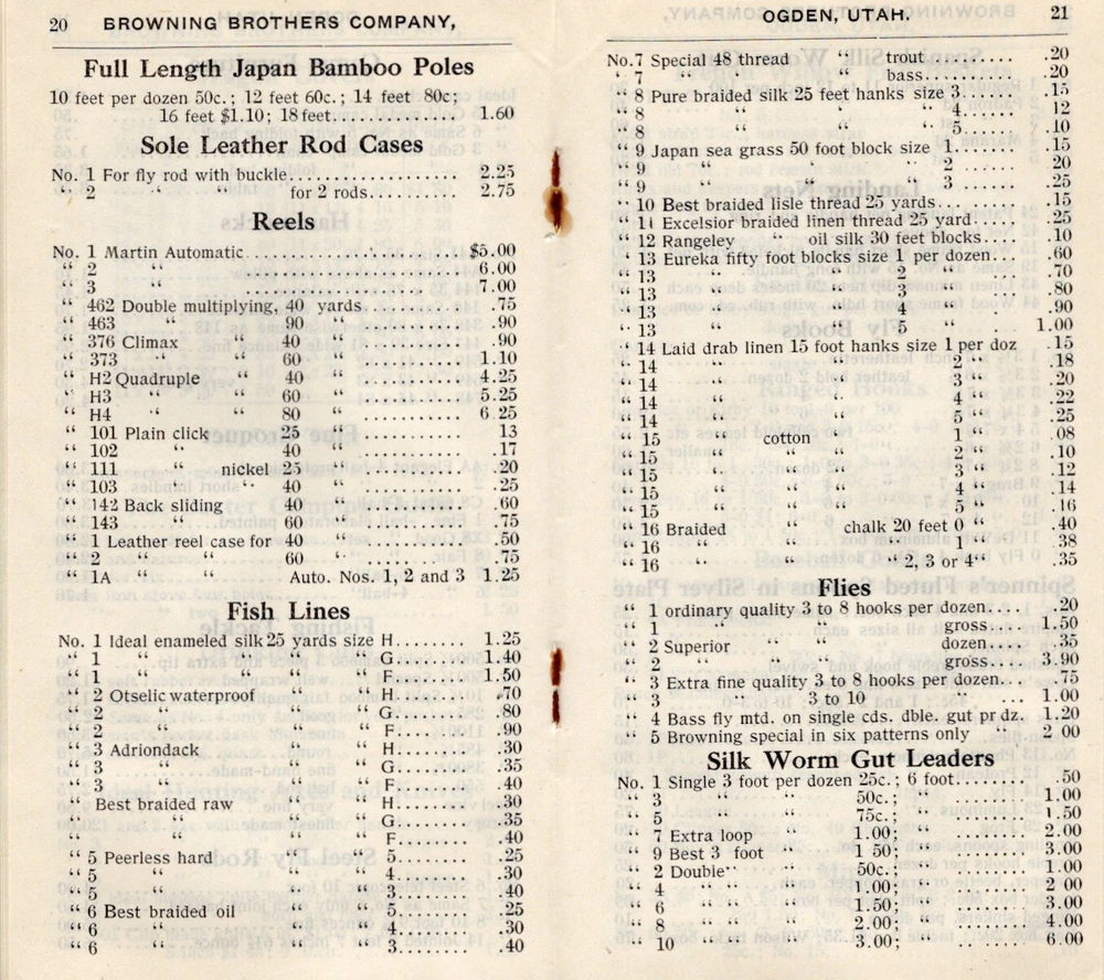 1907 Browning Brother's cover Ogden, Utah with 40 page catalog (3 1/2 x 6 inches) - guns, fishing, hunting gear, tents, cartridges, dog supplies, Kodak cameras, & sporting goods (football, baseball, tennis, etc.). Sent to S. R. Buford at Virginia City, Montana. Stain on front & back of cover. Firearms, rifles, shotguns, pistols, Winchester, Remington, Marlin, Smith, Parker, Ithaca, Baker, Stevens, Savage, Hopkins & Allen, Hamilton, Colt, Smith & Wesson, Iver Johnson, Harrington & Richardson. UT, MT, Mont. FREE Shipping .