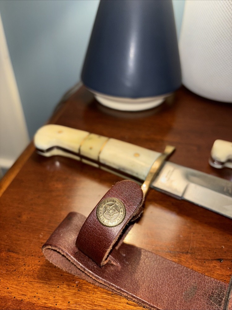 Got this item at the famous TV show “Pawn Stars” in Las Vegas!! Leather sheath having custom button closures etched with "Great Seal of the State of Oklahoma - 1907." circling a star motif. Timber Rattler small Classic Bowie knife having markings "Timber Rattler" on the ricasso. Full tang knife with bone scales and brass guard. Stainless steel. Overall length: 8 inches. Blade measures 4 inches. Handle measures 3.75 inches. 12 inch bowie knife also marked on the ricasso. Stainless steel. Overall measurements: 12 inches. Blade measures 6.25 inches. Handle measures 4.5 inches. Estimate: $1,500 - $2,500 just have no use for it anymore and I need the cash more right now.