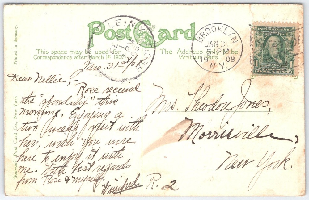 Discover a piece of early 20th-century New York history with this captivating postcard featuring the Methodist Church in Bay Ridge, Brooklyn. The detailed chromolithograph captures the architectural grandeur of the stone church, complete with its distinctive tower and large arched windows, set amidst a verdant landscape. This image offers a glimpse into the serene streetscapes and community landmarks of Brooklyn over a century ago. Published by the Souvenir Post Card Co. of New York and printed in Germany, this postcard showcases the superior printing techniques of the era. Its divided back design, postmarked January 31, 1908, confirms its historical context and authenticity. The postcard bears a personal message and is addressed to Morrisville, New York, adding a unique touch of personal history and a tangible connection to the past for collectors of New Yorkana, religious architecture, or early 20th-century ephemera.