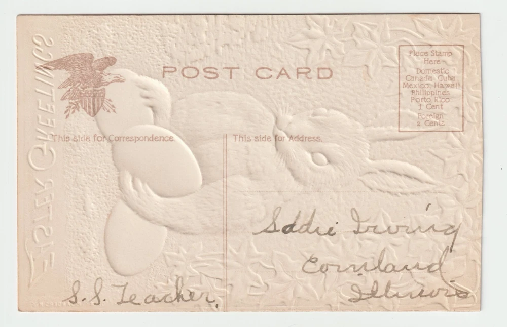 This vintage greeting postcard features a delightful image of a bunny rabbit guarding Easter eggs. The postcard was created by artist Philip Sander circa 1908 and is an original. The image is deeply embossed and airbrushed, adding to its charm and making it a wonderful addition to any collection of vintage postcards. The postcard has not been posted buy has writing on the back. It is a single unit and perfect for any holiday or animal lover. Width: 3.5 inches Height: 5.5 inches (all dimensions are approximate) Please refer to item photos for full visibility of item condition. Feel free to ask questions. Item is sold "as is". Item may have some scratches, small tears, edge and corner damage, creases, indentations, staining, etc. Please refer to all photos for accurate details on condition.