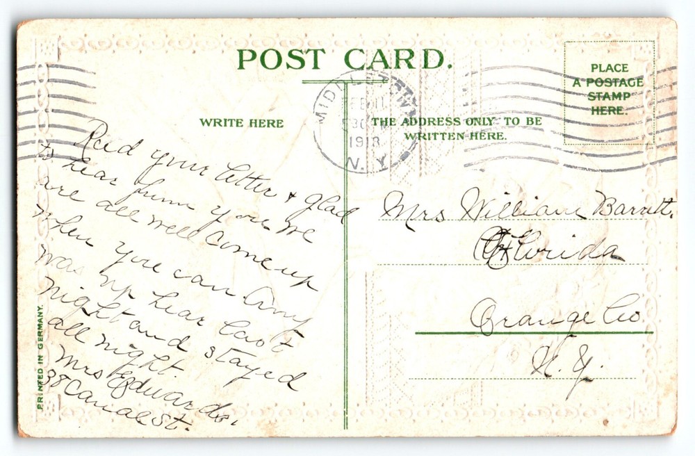 Posted with cancel. Dated 1908 by Wolf. Unknown artist signature on front? Antique original vintage post card. Has ink cancel marks on front, corner dings, and age wear. Stock #VAL156. Additional postcards are in our store. All post cards are old originals and may or may not have writing on back. Bundle and save by using cart and making single payment.