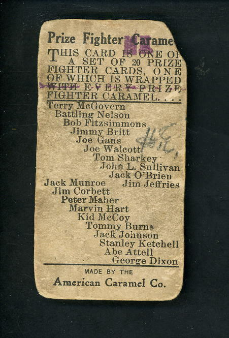 1909-1910 American Caramel Prize Fighter Caramels E75 Bob Fitzsimmons in poor condition as the card is missing the top left side, has corner wear, a small top right border crease and has pencil marks on the back. SHIPPING IS FREE. Please check out the many other boxing cards I have listed in my e-bay store. If you think you might buy multiple items from any seller that offers combined shipping, use the "Add To Cart" option under the "Buy It Now" button instead of the buy-it-now, and this will combine your purchases into one shipping charge as you add more items to your cart and purchase. Only make your payment after you have added all the items you want into your cart - you should then see that there is one charge for shipping when you go to make your payment. . (H&S, 08-17, #1635)