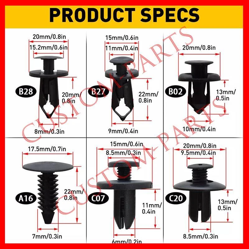 SAFE & SECURE SHOPPING 100% SATISFACTION GUARANTEED FAST SHIPPING You may also like You may also like NEW Land Rover Range Rover RR Sport LR4 3.0L 5.0L ENGINE OIL FILTER LR011279 US 15.99 USD Free shipping Body Bolts & U-nut Clips - M6 Engine Under Cover Splash Shield Guard For Hyundai 7.99 USD Free shipping NEW 2008-23 Subaru Forester Fog Light Driving Lamp Relay Impreza WRX 25230AA190 10.99 USD Free shipping NEW Thermostat Outlet Hose Connector (UPGRADE BRASS) Land Range Rover 5.0L 3.0L 5.99 USD Free shipping 2x Sun Visor Shade Holder Clip Retainer Beige for Honda Civic CR-V 88217S04003ZA 5.99 USD Free shipping 2Pcs/Pack Lock On Air Chuck 1/4NPT Closed Flow Brass Tire Air Chuck For Inflator 11.99 USD Free shipping 190X Car Clips for Hole Plastic Rivets Retainer Fender Push Pin Fastener Bumper Product Description Don't choose " NO LONGER NEED ITEM or ORDERED BY MISTAKE " , when you want to return the item. We will certainly deal with your any questions ASAP, pls don't open any CASE. Looking forward to your good store reviews Specifications: Material: ABS Placement on vehicle: Various fasteners to meet the needs of different parts of the car. Used widely for car fender, bumper, door or other car surface. Universal for: Most of car models such as for Volvo, BMW, GM, Ford, Toyota, Honda, Nissan, Mazda, Chrysler, Volkswagen, Mercedes Benz, Audi, etc. Features: *Wear and corrosion resistance The retainer clip with wear and corrosion resistance is not easy to break or crack in use. *ABS material Made of superior ABS material to ensure its long service life and durability. *Simple installation Simple installation with direct replacement,other modifications are not required. *Stable performance The retainer clip with stable performance provides a better shopping experience for our customers. Packaging include: A16: 40PCS C07: 50PCS C20: 30PCS B28: 20PCS B27: 30PCS B02: 20PCS STORE INTRODUCTION DELIVERY AND RETURN CONTACT US STORE INTRODUCTION Serving US market since 2018. Based in California offering the best quality and lowest price items, offer various types of auto parts . We can customize or wholesale all the items according to customers' requirements. And we would appreciate it if you could give us your favorable comments. If you have any questions at any time, you can contact us any time. DELIVERY AND RETURN We will dispatch your purchase within 3 business day after payment clearance. Shipping Time is around 3-5 business day Pls contact us first when you want to return the item, and pls choose " NO LONGER NEED ITEM or ORDERED BY MISTAKE " , DON'T open any case. otherwise any direct return of purchased items will not be processed. We will closely examine the condition of the returned items and will not issue any refund/exchange before we make sure the items are in their original neat conditions. CONTACT US Before leaving us neutral or negative feedback, please contact us first. We will do everything we can to give you a satisfying solution. Please don't open case via eBay. Please don't open any return request before contact us. We do our best to resolve any issue. Leaving negative feedback and low ratings doesn't get things solved. So please talk with us and we will not let you down. Copyright © 2022 Tongtool