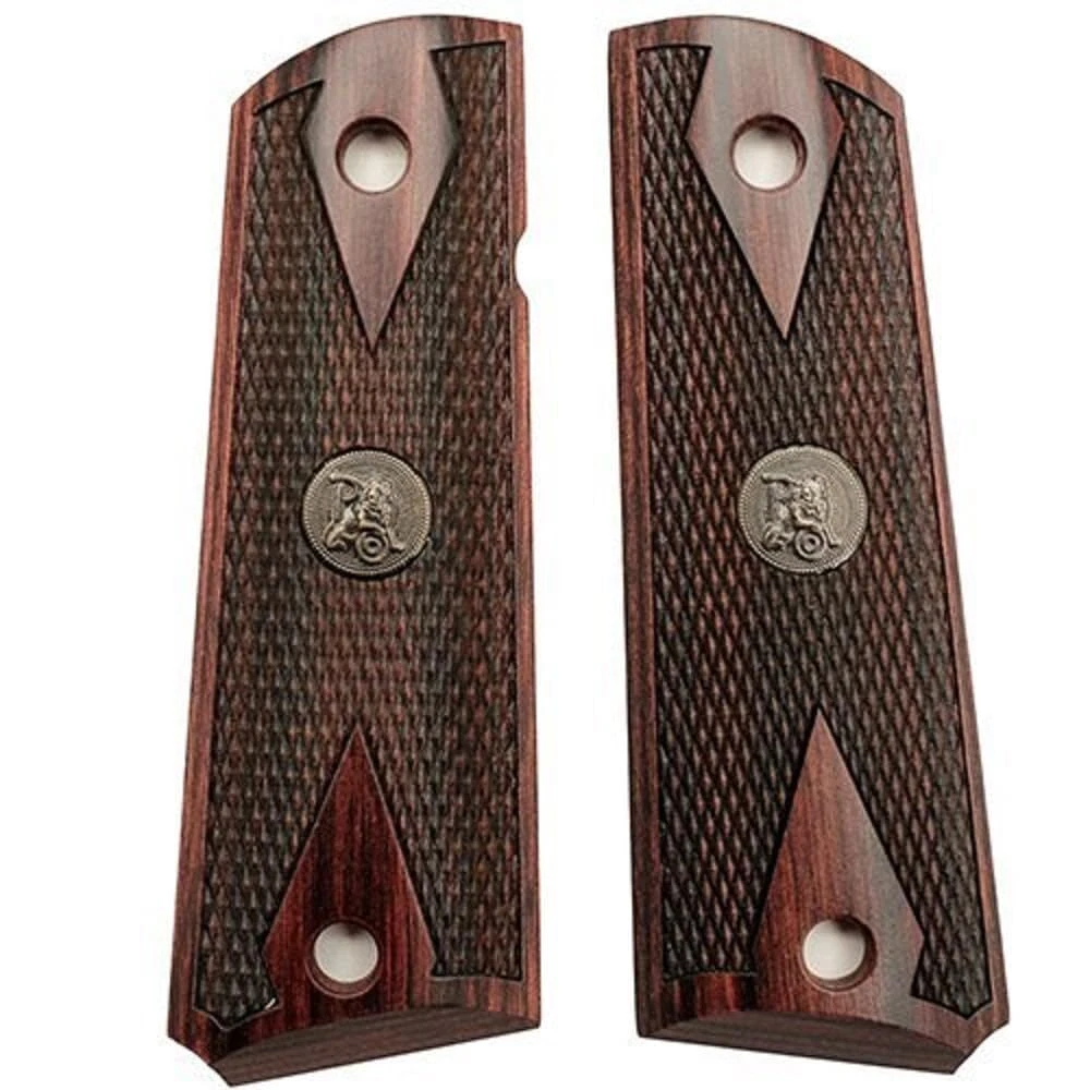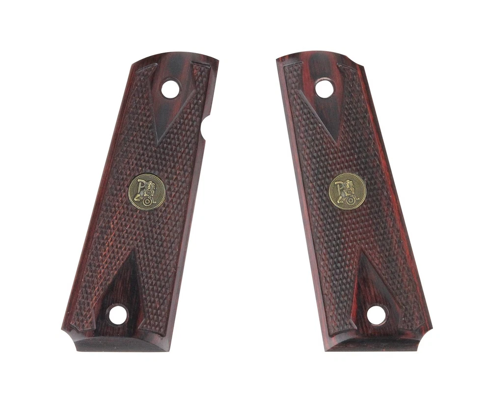 rosewood grip panels are hand matched to improve the style of any full-sized 1911. They are laser cut with precise checkering to improve the handling as well. Crafted in tough Dymondwood laminate, they carry tasteful medallions on both sides and are offered in double-diamond or half-checkered patterns. has also crafted-in important additional features like notches for ambidextrous safeties and a beveled grip bottom with a cut-out for the mainspring housing pin. Specifications: - Fits: Colt 1911 - Color: Double Diamond Rosewood - Weight: 3oz Highly polished rosewood laminate grips that provide a timeless look and perfectly accent blued and stainless handguns Superior Fit- Renegade wood grips are machined to exact specifications and will not wobble or shift on the handgun's frame Grip Texture- Double diamond checkering provides enhanced traction offering the user more control when drawing, and while firing Fits- 1911 Govt. and Commander sized pistols from manufacturers like: Colt, Kimber, Springfield Armory, Remington, Sig Sauer, Ruger, Rock Island Armory, Smith and Wesson, and more - We stand behind our high quality gun grips with a Limited