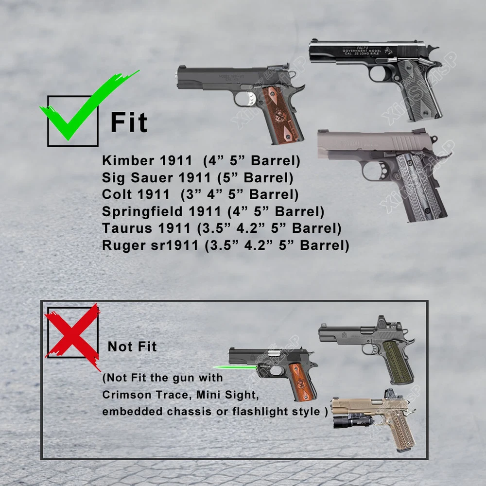 High Quality Military & Police Grade Polymer OWB Holster Specially Designed For Fast Draw During Duty Or Shooting Competition. Outside Waistband Tactical H olster with Belt Clip method for Non-Railed Versions of 1911 Models (For 9mm, .40 only). Holster fit 1911 Holster fit Dan Wesson Dan Wesson Specialist 5" 9mm Luger Dan Wesson Guardian 4.25" 9mm Luger 1911 Holster fit Ed Brown Ed Brown Special Forces 5" 9mm Luger Ed Brown Kobra Carry 4.25" 9mm Luger 1911 Holster fit Kimber Kimber 1911 5" 9mm Luger Kimber 1911 Pro 4" 9mm Luger Kimber Custom II 5" .40 S&W Kimber Pro Carry II 4" .40 S&W 1911 Holst er fit Nighthawk Custom Nighthawk Custom Talon 5" 9mm Luger 1911 Holste r fit Rock Island Armory (Armscor) Rock Island Armory 1911 Ultra FS 5" 9mm Luger Rock Island Armory 1911 FS Tactical 5" .40 S&W 1911 Hols ter fit Springfield Springfield 1911 EMP Champion 4" 9mm Luger Springfield 1911 Loaded 5" 9mm Luger Springfield Armory 1911 Loaded 5" .40 S&W Springfield Armory 1911 Loaded Target 5" .40 S&W 1911 Hols ter f it STI International (Staccato) STI Trojan 5" . 9mm Luger 1911 Hols ter fit Taurus Taurus 1911 5" 9mm Luger Taurus 1911 Commander 4.2" 9mm Luger 1911 Holste r fit Walther Walther Colt 1911 A1 5" .22 LR 1911 Holste r fit Wilson Combat Wilson Combat CQB 5" 9mm Luger ( I t perfect fit the 1911 gun without Optic Mount Mini Sight a bove on the end of the barrel , but also without laser and embedded chassis, and flashlight style ) Ease And Comfort Push side buttons to achieve the fast opening and closing, unique design allows for belt carrying or vest carrying, perfectly used by duty holsters, uniformed law enforcement officers, security personnel, military personnel, private persons, and shooting sports holsters. And it fits closer to the body which can achieve better concealment under clothes. High S afety Secure Level II Retention - Auto-locking system restrain pistol in the holster to ensure ultimate safety, activate the release by pressing the button with the index finger to achieve gun access Adjustable Easily set Holster 360 degrees to your desire position with Allen key, compatible belt width up to 2 inch Tough & Durable Material Custom-molded body made of polymer stronger than leather that will wear out, adapt to every bad environment In the Package: · 1*Holster with Paddle Attachment · 1*Allen Key Shipping: Ships same day or next except Sundays and Holidays ! Free shipping! Ship by USPS First Class Package. 100% MONEY BACK GUARANTEE. Any question please be free to contact with us First .Thanks!