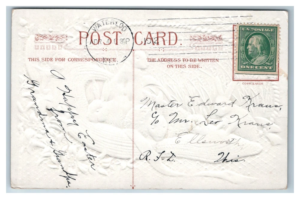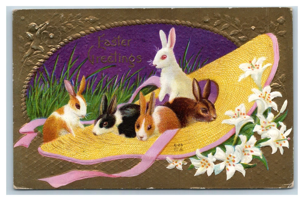 This vintage postcard features a charming illustration by E. Nash, depicting adorable bunny rabbits sitting inside a sun hat and surrounded by lily flowers and a gold gilt border with flowers and a cherub. The postcard is an original print from 1912 and was posted in the United States. It is a lovely addition to any collection of holiday-themed or animal-themed postcards. The postcard is printed using the lithography technique and has an embossed design. It is in good condition and is a single unit. Width: 5.5 inches Height: 3.5 inches (all dimensions are approximate) Please refer to item photos for full visibility of item condition. Feel free to ask questions. Item is sold "as is". Item may have some scratches, small tears, edge and corner damage, creases, indentations, staining, etc. Please refer to all photos for accurate details on condition.
