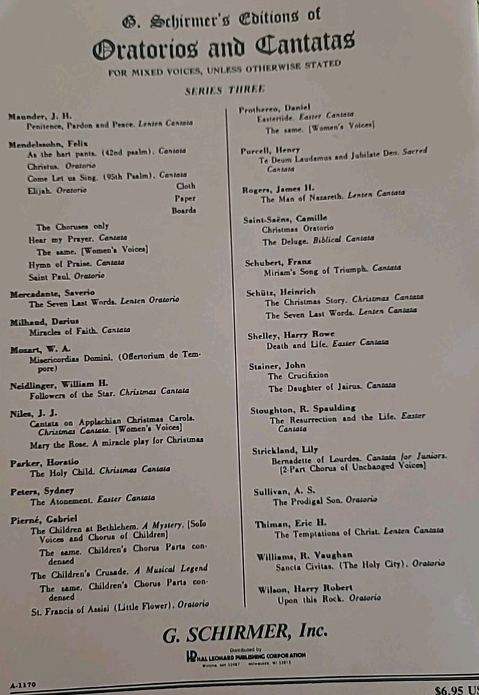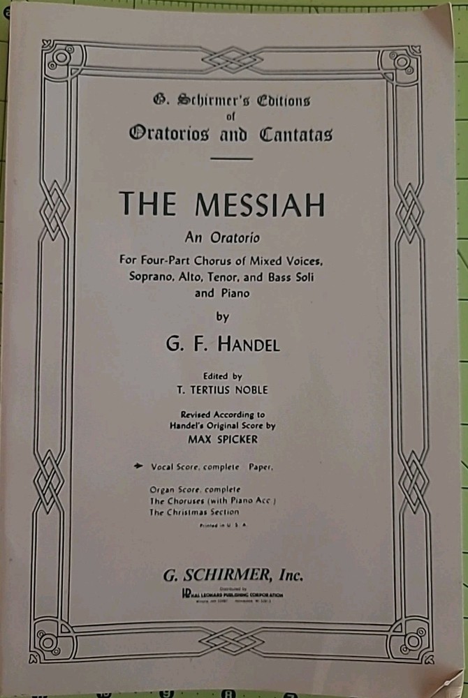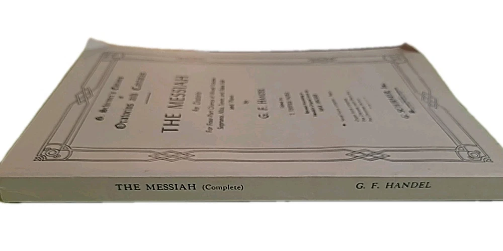 The Messiah – An Oratorio by G. F. Handel Schirmer’s Editions of Oratorios and Cantatas – Series Three Edited by Tertius Noble • Revised by Max Spicker G. Schirmer, Inc. • Copyright 1912 This is a complete vocal score edition of Handel’s Messiah, one of the most performed sacred choral works in history. This edition was specifically prepared for four-part mixed chorus (SATB), soloists, and piano, making it ideal for church choirs, university music departments, and professional choral performance. Unlike common reprints, this is an original early-20th-century Schirmer performance edition still sought after for its clear engraving, traditional voicing, and dependable editorial structure. Condition: • Solid binding All pages present • No missing sections • Light cover wear consistent with age • No stains, no loose pages • Interior clean and very usable This is an evergreen sacred performance score — not a modern reprint. USPS Ground Advantage (boxed, not envelope)