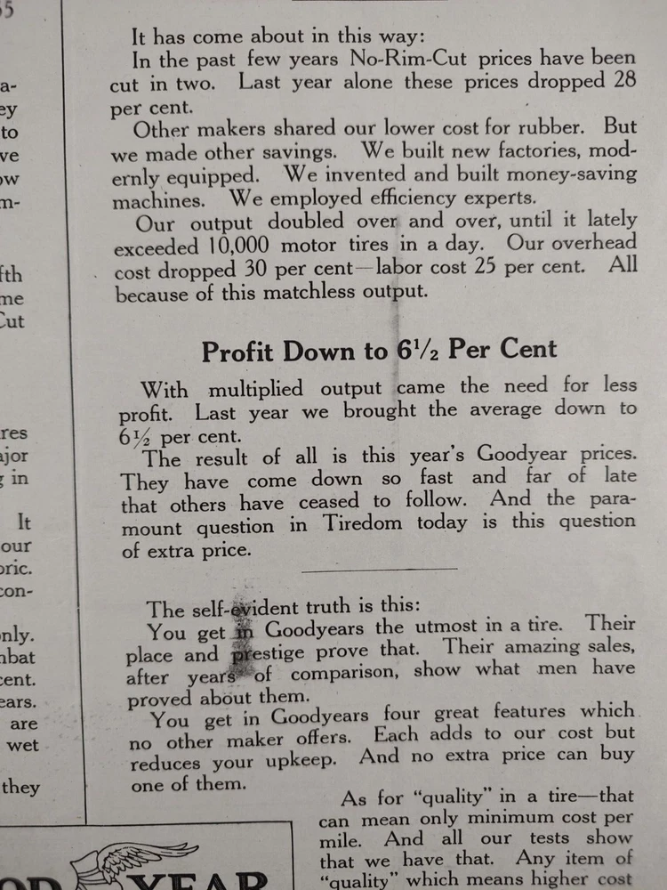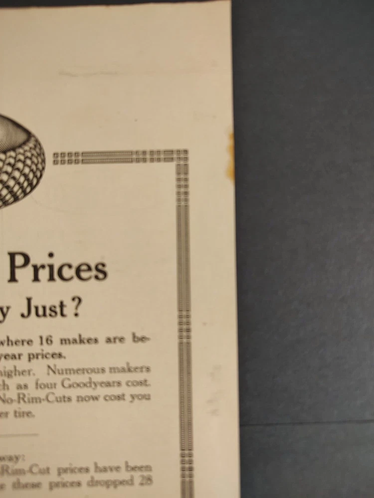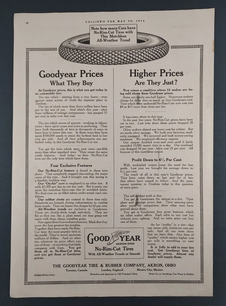 1914 Goodyear Tires Original Vintage Print Ad "Akron, OH Collier's Original advertisement, not a reproduction. Some print defects, stain on edge. Please see photos. Shipped carefully in archival bag in sealed stiff envelope. Approximately 15” x 10.5" Source: Collier's May 1914 B&W print Reduced shipping available when purchasing multiple ads at the same time. Normal wear associated with an old magazine, newspaper etc. It may have fading, discoloration, creases, a corner bump, ink on the front, etc. Please view all the photos for condition and use the zoom feature. Due to the range of viewing device configurations, actual colors might differ slightly from the scans/photographs. All measurements are approximate. Print Ads Make Great Gifts that Can be Framed!