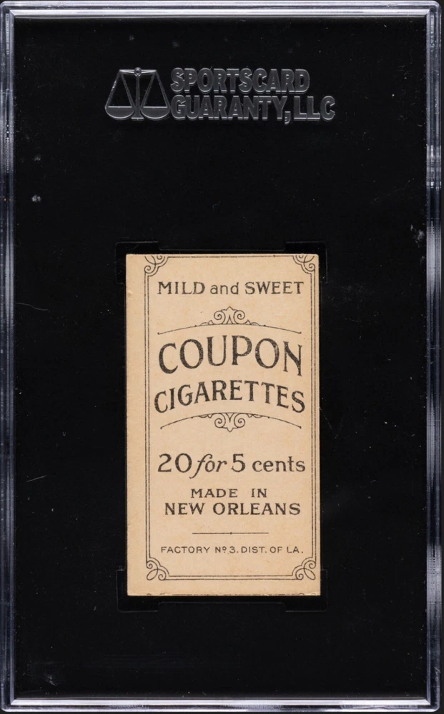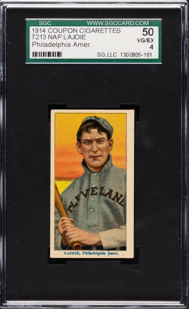 This is a rare 1914-16 T213 Coupon Cigarettes Type 2 trading card featuring the legendary Hall of Famer Nap Lajoie of the Philadelphia Athletics. Sportscard Guaranty Corporation (SGC) graded this card as 50, SGC 4 VG-EX (Very Good/Excellent). Pop 1. This is the highest-known graded copy of the Philadelphia Amer. variety in existence . The next-highest SGC-graded copy of this card is SGC 3 (Pop 3). The highest-known PSA-graded copy of this card is PSA 2 (Pop 1, with Qualifier). The highest-known BVG-graded copy of this card is BVG 2 (Pop 1). Please contact me if you have any questions or if you need additional photos. Placing a value on a card like this is challenging. Please feel free to make an offer. I'm always open to a reasonable discussion. Don't miss this opportunity to own the highest-quality example of this card in the world.