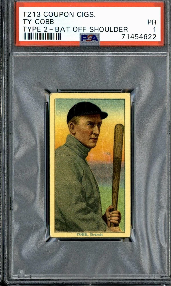 Graded: Yes Type: Sports Trading Cards Franchise: 1914 T213 Coupon Cigs. Card Condition: Poor Card Name: Ty Cobb (Bat off Shoulder) Sport: Baseball Team: Detroit Tigers Season: 1914 Grade: 1 Professional Grader: Professional Sports Authenticator (PSA) Player/Athlete: Ty Cobb (Bat off Shoulder) Set: 1914 T213 Coupon Cigs. Manufacturer: T213 Coupon Cigs.