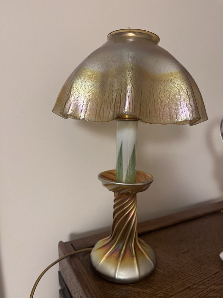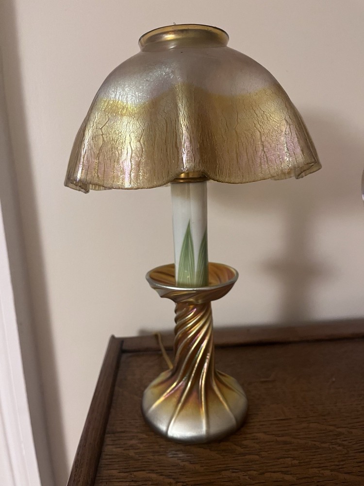 American Tiffany candlestick lamp working with plug, signed LCT, Louis Comfort Tiffany, with gilt iridescent shade and base and S P candleholder, circa 1915. 14 high 7.5 wide at top (shade) 5 base