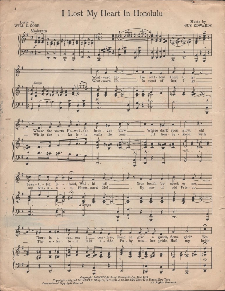 I Lost My Heart in Honolulu Original Hawaiian sheet music 1916 Music by Gus Edwards Words by Will D. Cobb Drawing of hula maiden Visit our store for 2,000+ items – Thank You!