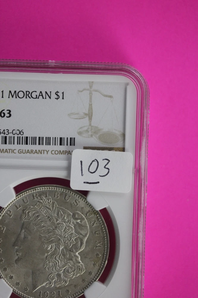 Country/Region of Manufacture: United States Precious Metal Content per Unit: .7734oz Brand: US Mint Brand/Mint: U.S. Mint Coin: Morgan Silver Dollar Fineness: 0.900 Total Precious Metal Content: .7734oz Strike Type: Business Grade: MS 63 Year: 1921 Seller Notes: “You will receive the exact same coin in the pictures. The background I use for pictures is colored.” Composition: Silver Certification Number: na Certification: NGC