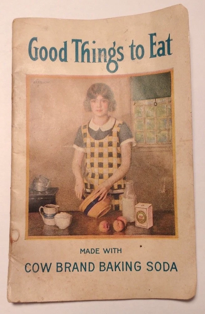 1924 Good Things to Eat Made with Cow Brand Baking Soda Cookbook Booklet This listing is for a 1924 Cow Brand Baking Soda "Good Things to Eat" Cookbook Booklet. The booklet has some wear to the edges, and corners. Booklet has some creases (lower left corner) along with some marks, spotting and discoloration. Interior pages are in good condition. Please refer to the description and photographs for more information.