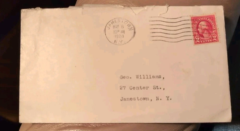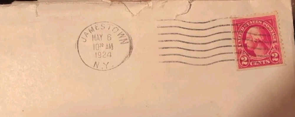The item is a used 1924 letter originating from New York, United States, featuring a 2 Cent red George Washington stamp. The stamp has a machine cancelation and is uncertified. It is an authentic piece of postal history with a notable historical figure depicted on it. The envelope with the stamp provides a glimpse into the postal system and communication methods of the early 20th century in the United States. See scans to help see the condition.