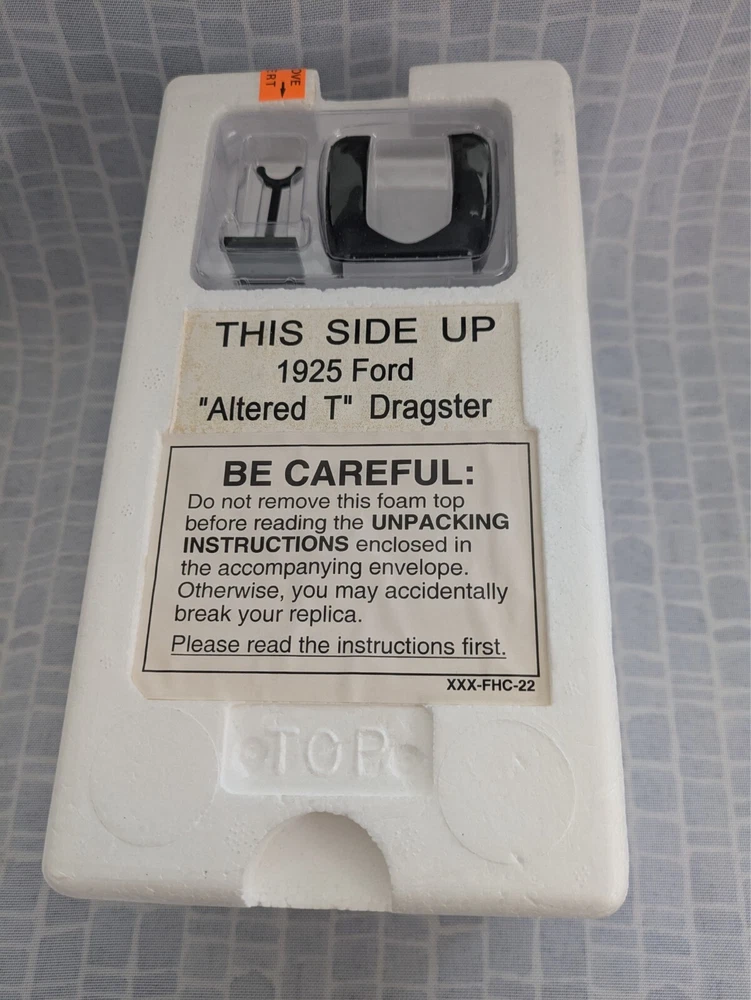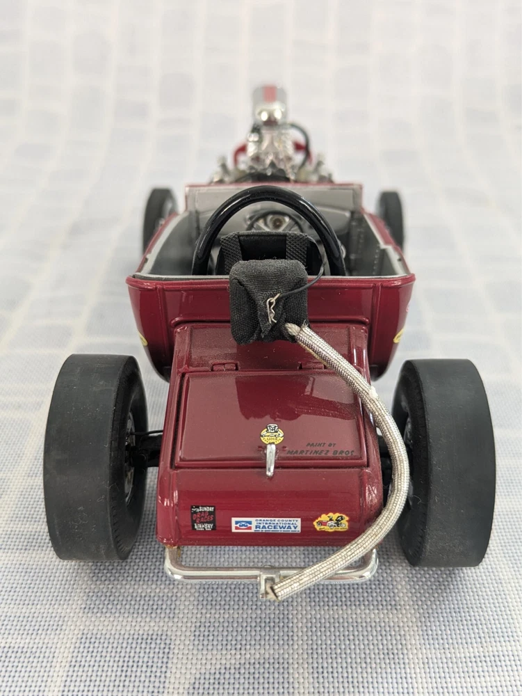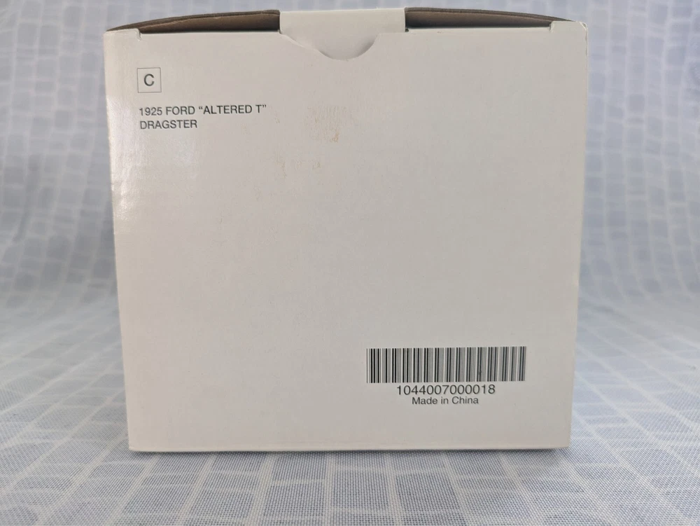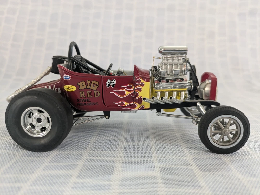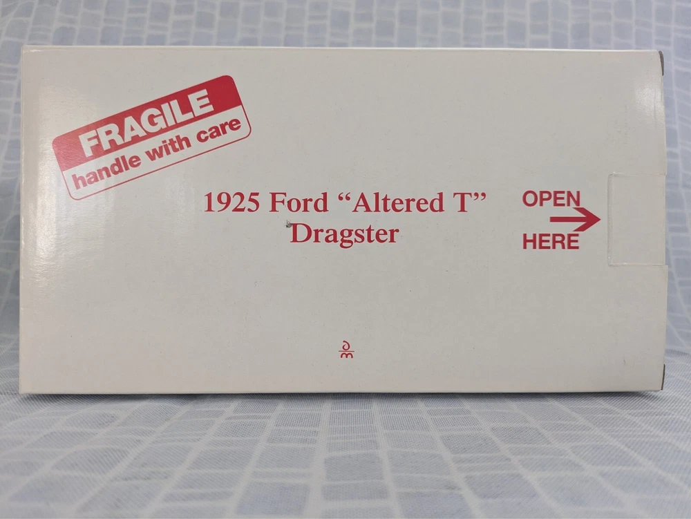This is from my late father in law's die cast collection. It is a die cast model of a 1925 Ford Dragster, "Altered T." It has the name "Big Red" on the sides of the doors. It is a 1:24 scale model made with the detail and quality that the Danbury Mint is known for. This model has lived in the box since purchase in a smoke free home. Thanks for looking.