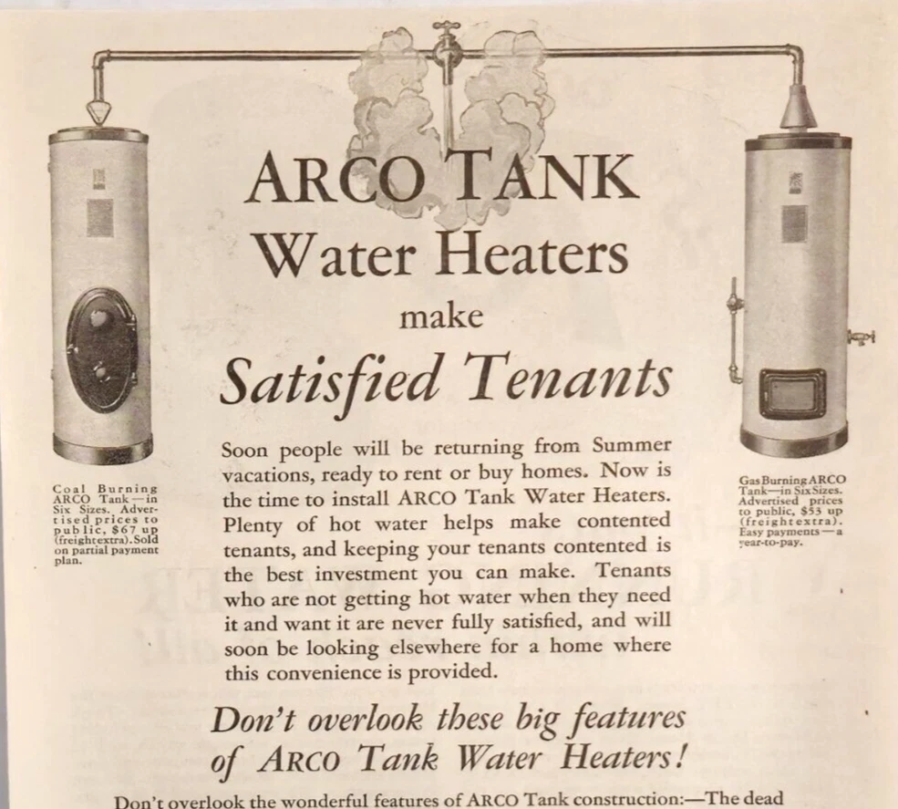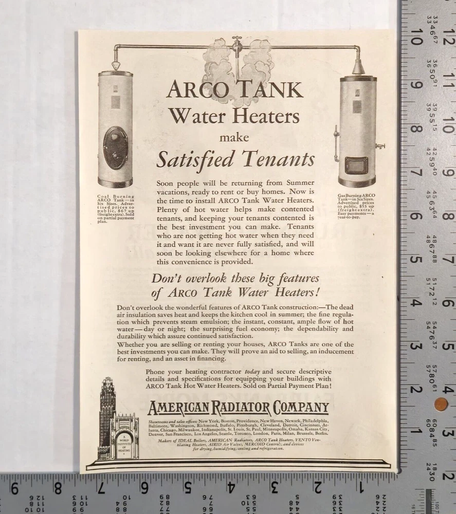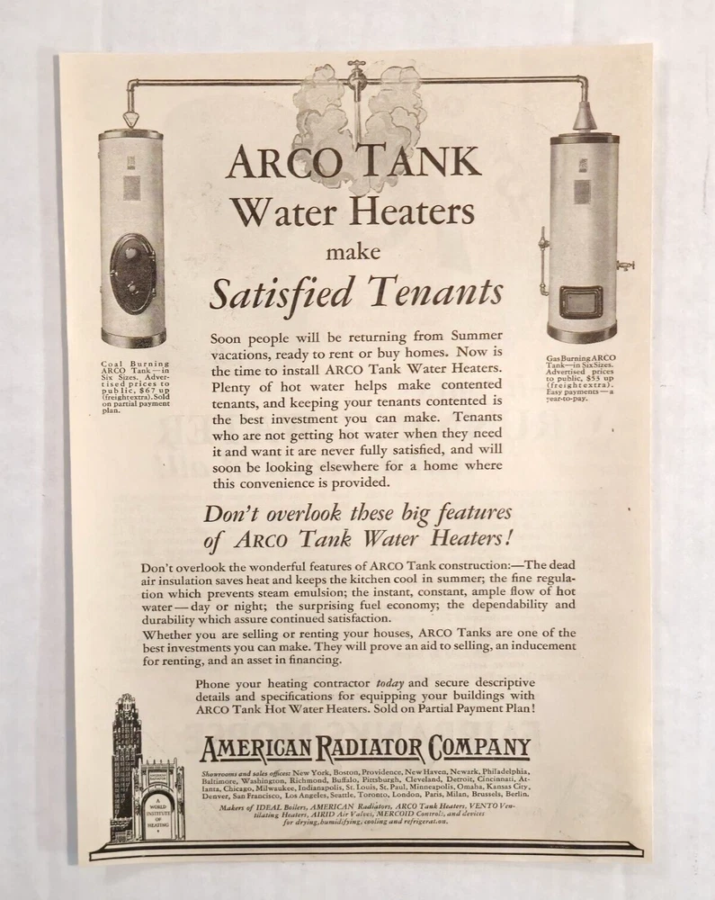 1927 ARCO Tank Water Heaters - American Radiator Co, New York NY - Vtg Print Ad