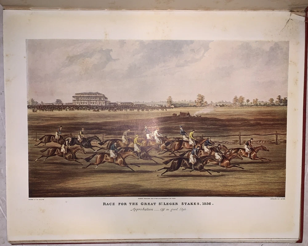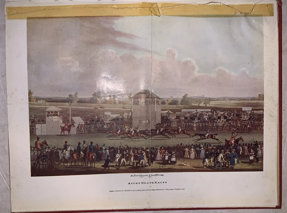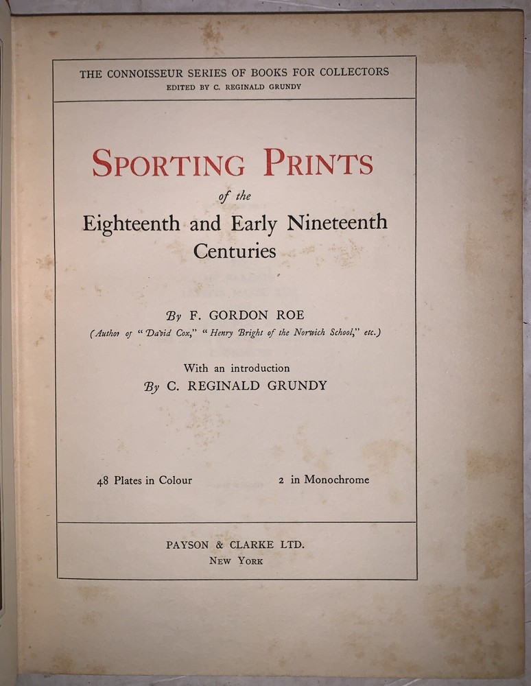 The Connoisseur Series of Books for Collectors, Edited by C. Reginald Grundy Sporting Prints of the Eighteenth and Early Nineteenth Centuries By F. Gordon Roe With an Introduction by C. Reginald Grundy 48 Plates in Colour - 2 in Monochrome New York: Payson & Clarke Ltd 1927 First American Edition Quarto, xiv, 50 pages followed by a large section of colored plates. Publisher's original gilt lettered red cloth covered boards, top edge gilt. Some rubbing and wear, spine sunned, hinges cracked, tape repairs and tears to a few of the plates, discoloration and foxing, else in good condition. If you have any questions, feel free to ask, and don't forget to check out my other listings.