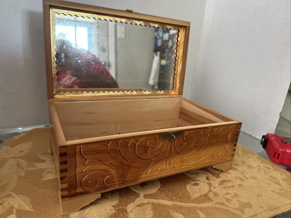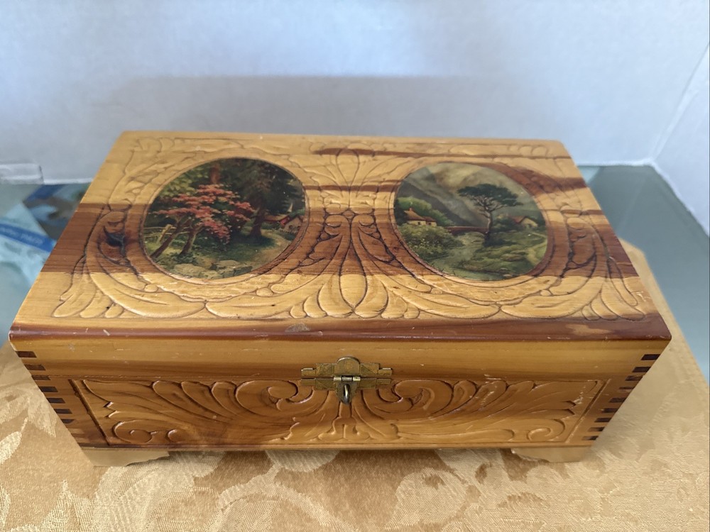 This exquisite jewelry box from the 1930s is a stunning piece of art deco craftsmanship. The carved wood design features beautiful Italian river prints and a mirrored finish. With a size of 10.5 inches in length and 6 inches in width, this medium-sized box is perfect for storing your precious jewelry and keepsakes. The box is made of high-quality cedar and is adorned with a vintage brand label. It has a unique character of Lake Como and is suitable for all occasions. This collectible item is perfect for adults who appreciate the beauty and craftsmanship of vintage jewelry boxes. It is a must-have for those who love the art deco style and want to add a touch of elegance to their home decor. Look at the pictures before making your purchase