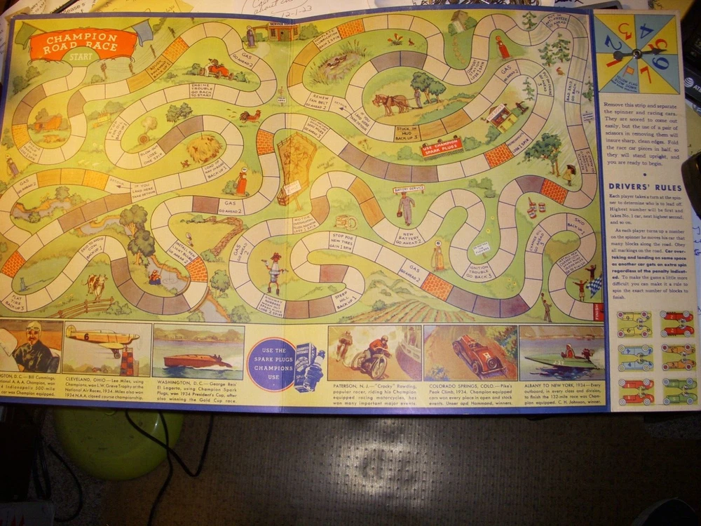 Immerse yourself in the golden era of automotive racing with the vintage 1930's Champion Spark Plugs Road Race Game. A genuine piece of history, this original game hails from a time when gas and oil companies vied for patronage with creative advertising. Complete with its multi-colored pieces, this game is not only an entertaining pastime but also a collector's item, embodying the spirit of an bygone age. Crafted in the United States, the game reflects the period's fascination with high-octane entertainment and the thrill of the race. Its brand heritage is unmistakably Champion Spark Plugs, a name synonymous with the legacy of automotive performance. Whether for play or display, this unique item celebrates the confluence of advertising and gaming, offering a rare glimpse into the culture of early 20th-century America.INCLUDES ALL GAME PIECES CONNECTED TO GAME BOARD TO THE RIGHT OF PHOTO NUMBER TWO . THIS GAME IS UP TO SIX PLAYERS ! THE SPINNER IS LOCATED TO THE UPPER RIGHT OF PHOTO NUMBER TWO ! GAME RULES ARE TO THE RIGHT OF PHOTO NUMBER TWO . PLEASE LOOK AT PHOTOS !! ALTHOUGH SELLER DOESN'T ACCEPT RETURNS , BUYER IS PROTECTED BY EBAY BUYERS PROTECTION PLAN !
