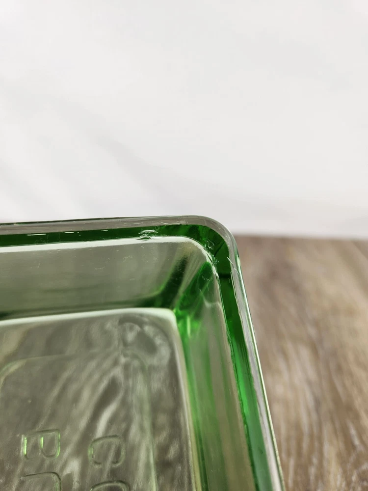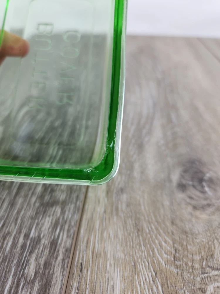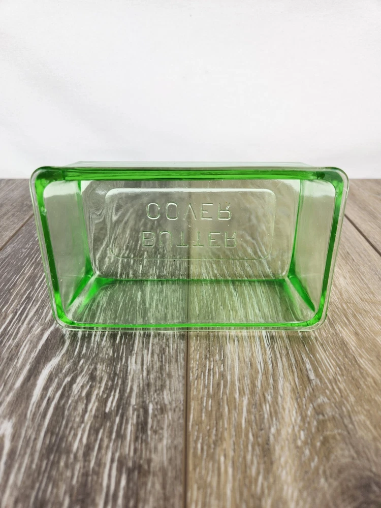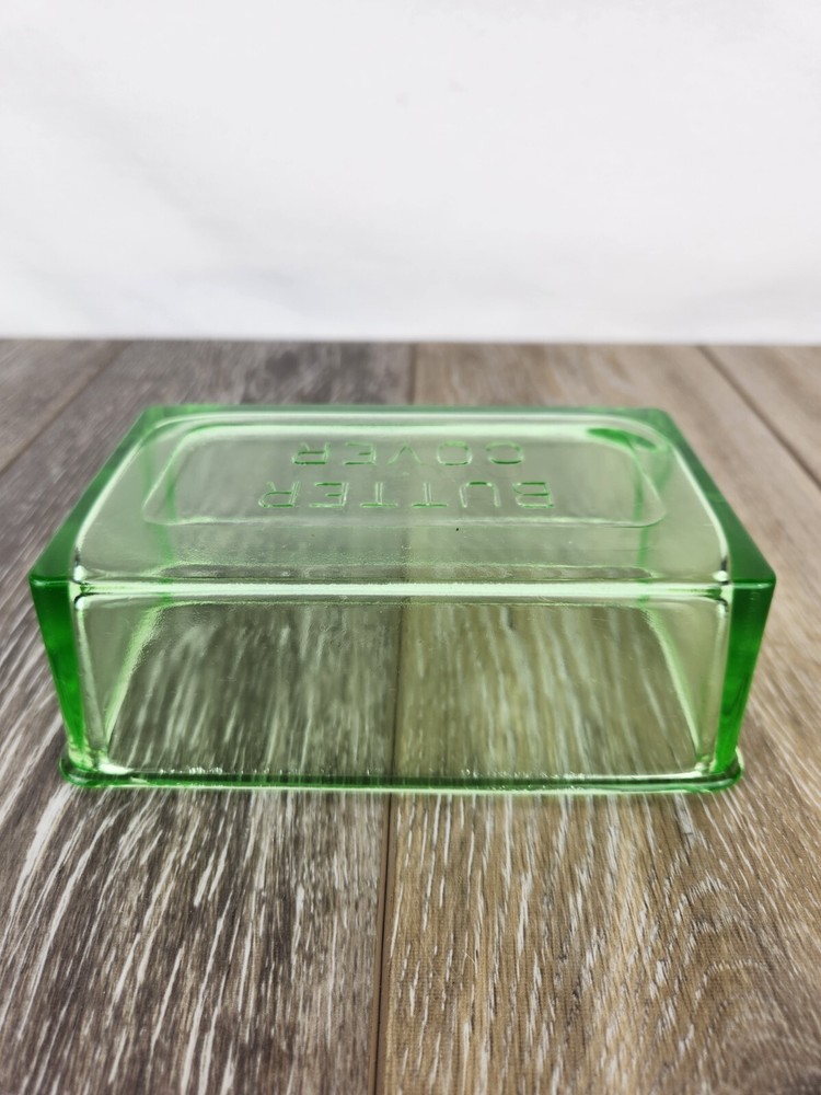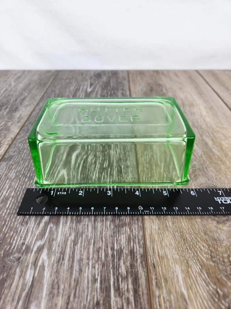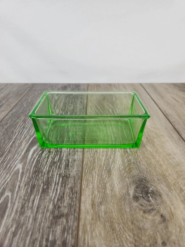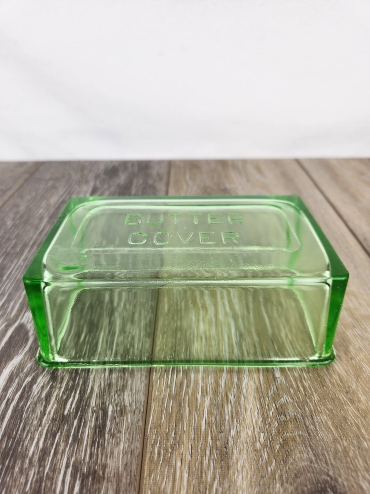 This Hazel Atlas green uranium glass butter dish lid is a perfect replacement for your vintage set. Dating back to the 1930s, the Art Deco design and luminous glow under UV light make it a sought-after piece for collectors. Whether restoring a butter dish or adding to your uranium glass collection, this replacement lid offers charm and authenticity. This could also be used as a simple bowl or dish for storing things without the bottom at all. This butter dish lid is 6" x 3.75" x 2". It is embossed with "Butter Cover" on the top of the lid. The UV Photo taken here is with 395nm blacklight, but it will also glow under 365nm.