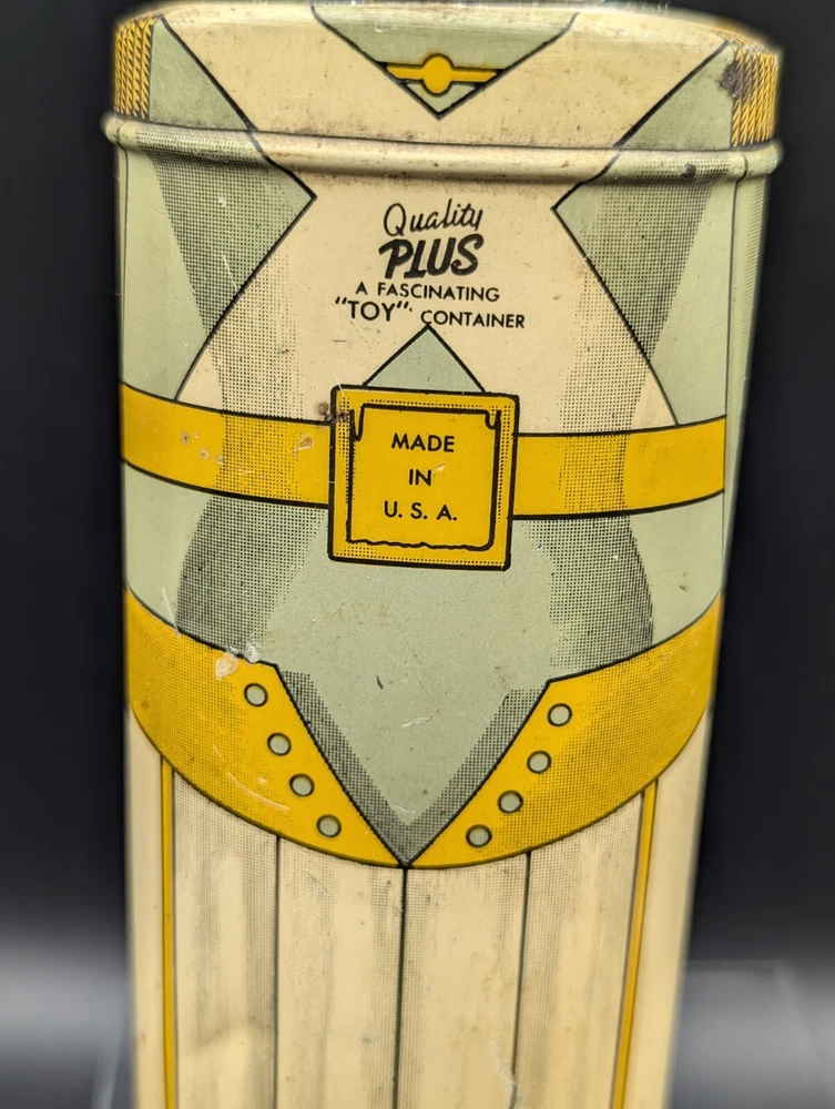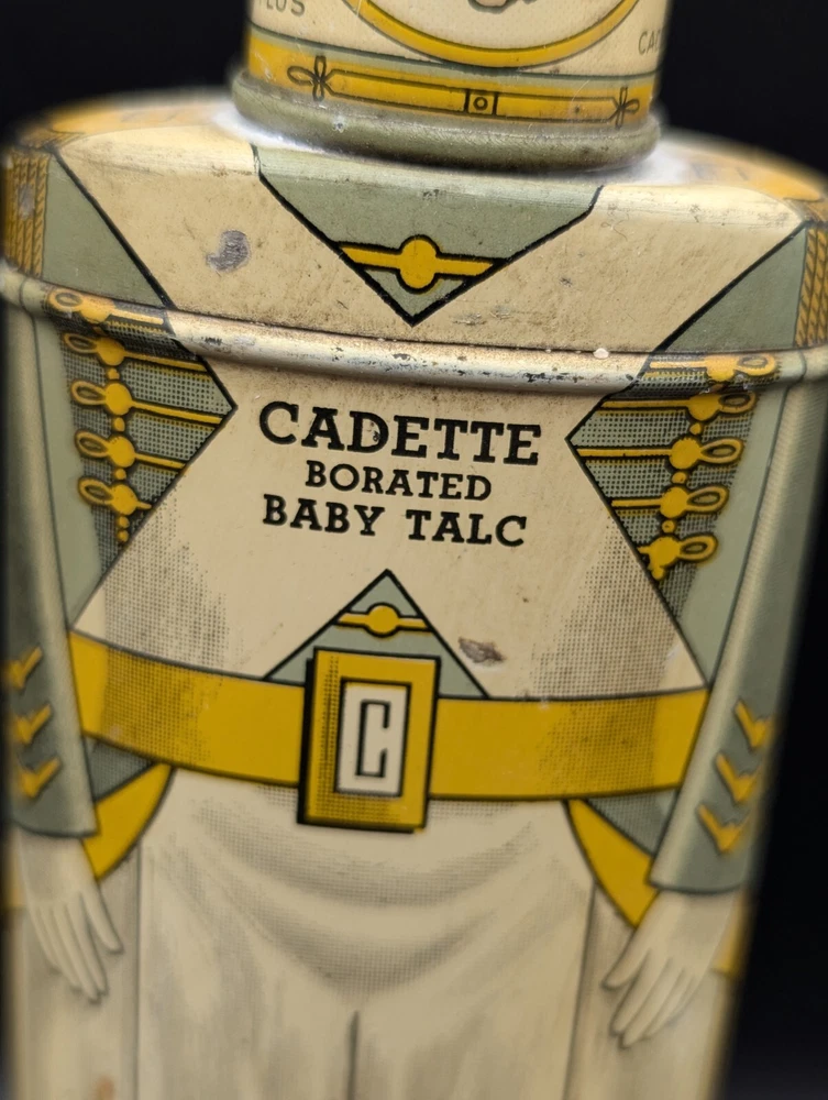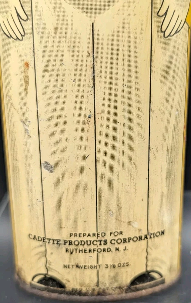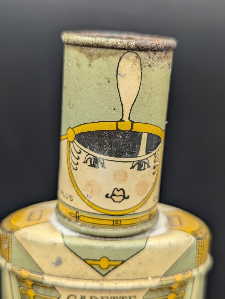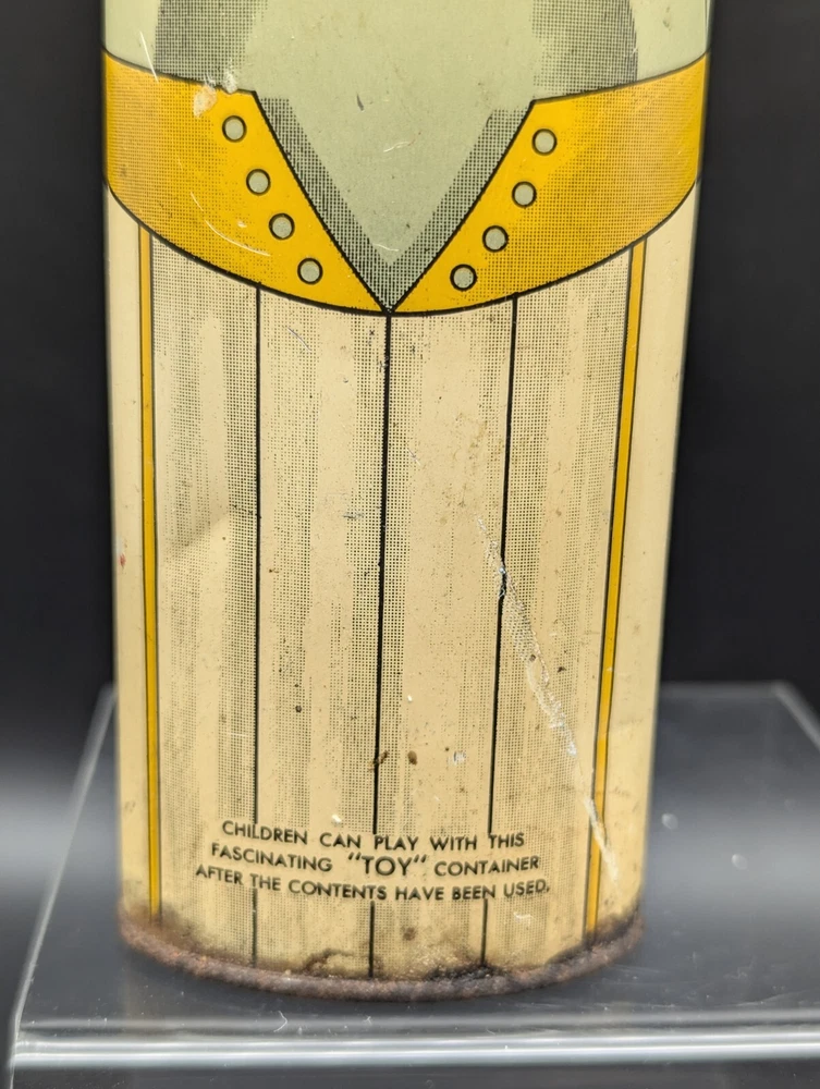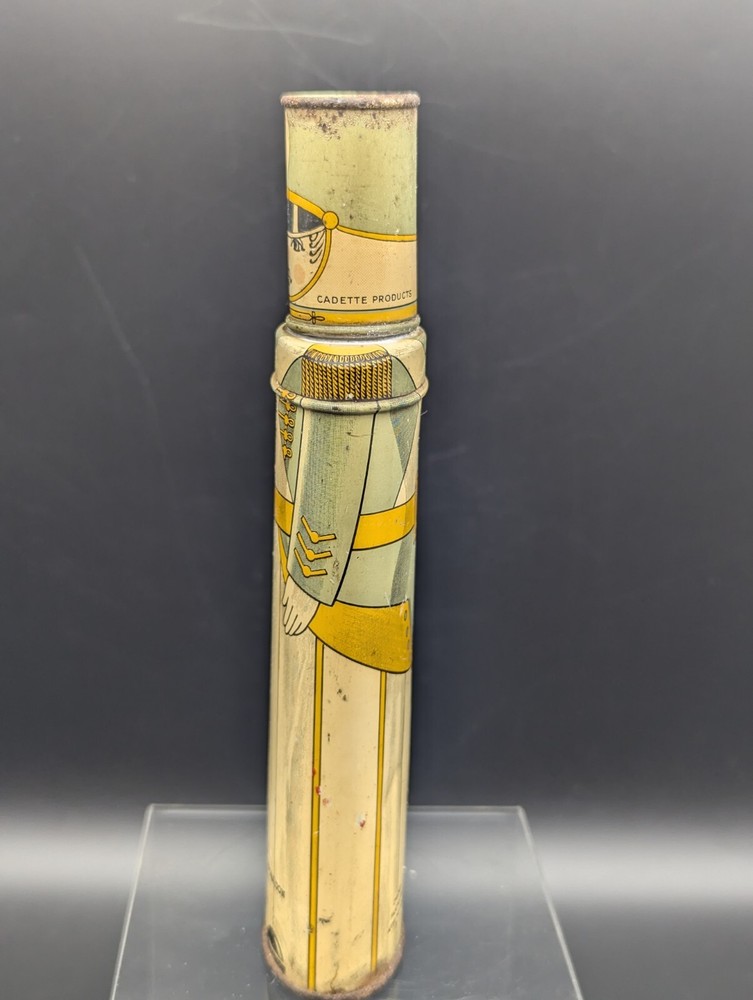 This vintage Cadette Products talcum powder tin is a must-have for collectors of advertising memorabilia. The tin is shaped like a toy soldier and features multi-color graphics that are sure to catch the eye. Made in the United States in the 1930s/40s, this original piece is a rare find! The tin is perfect for display or as a decorative piece. Don't miss out on the opportunity to own this unique and original piece of history.