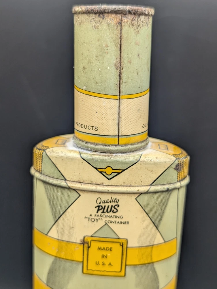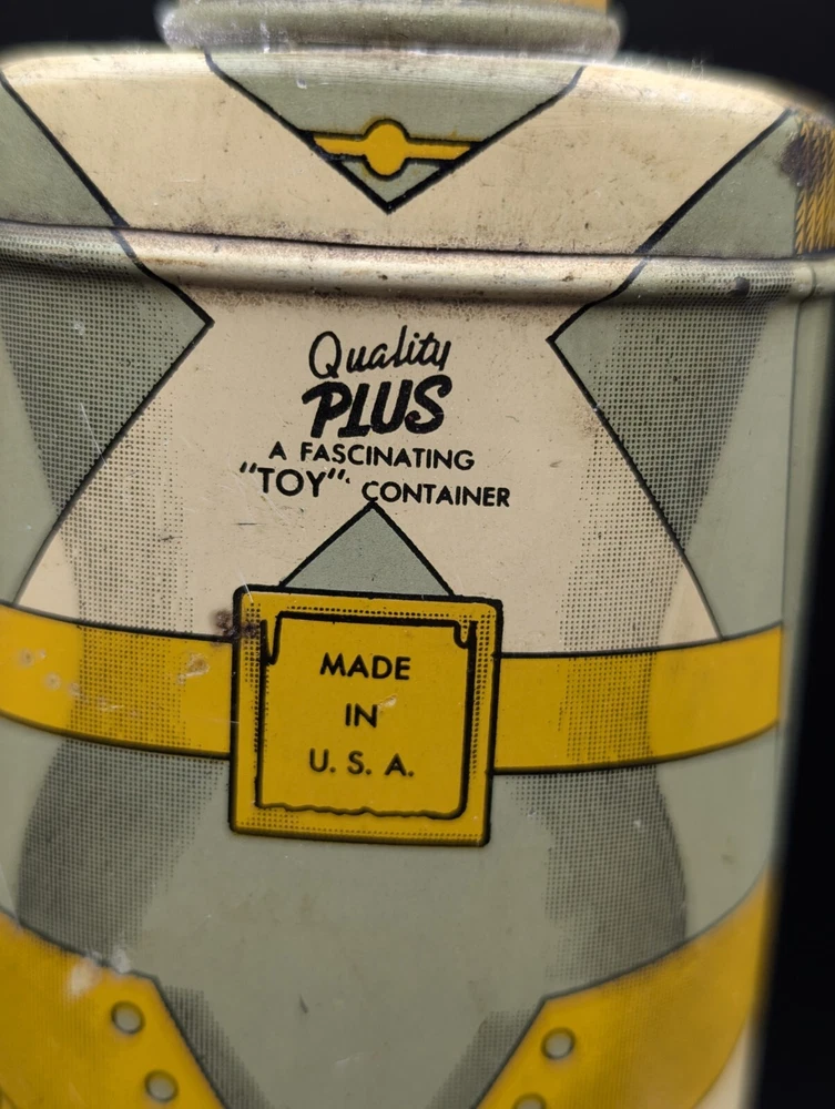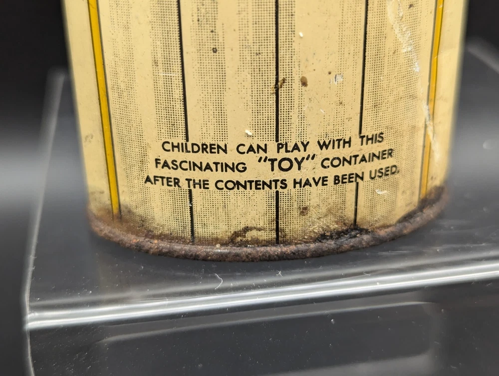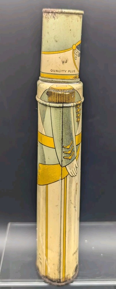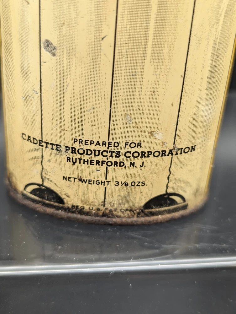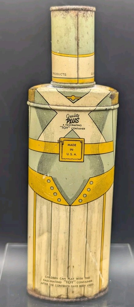 This vintage Cadette Products talcum powder tin is a must-have for collectors of advertising memorabilia. The tin is shaped like a toy soldier and features multi-color graphics that are sure to catch the eye. Made in the United States in the 1930s/40s, this original piece is a rare find! The tin is perfect for display or as a decorative piece. Don't miss out on the opportunity to own this unique and original piece of history.