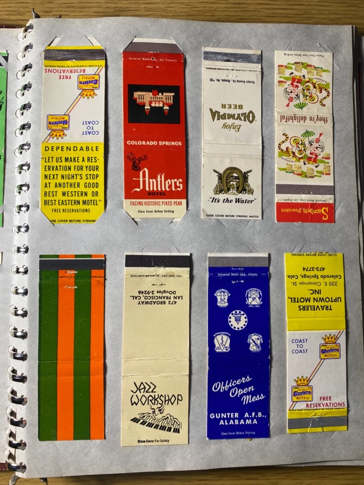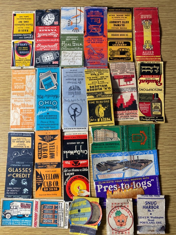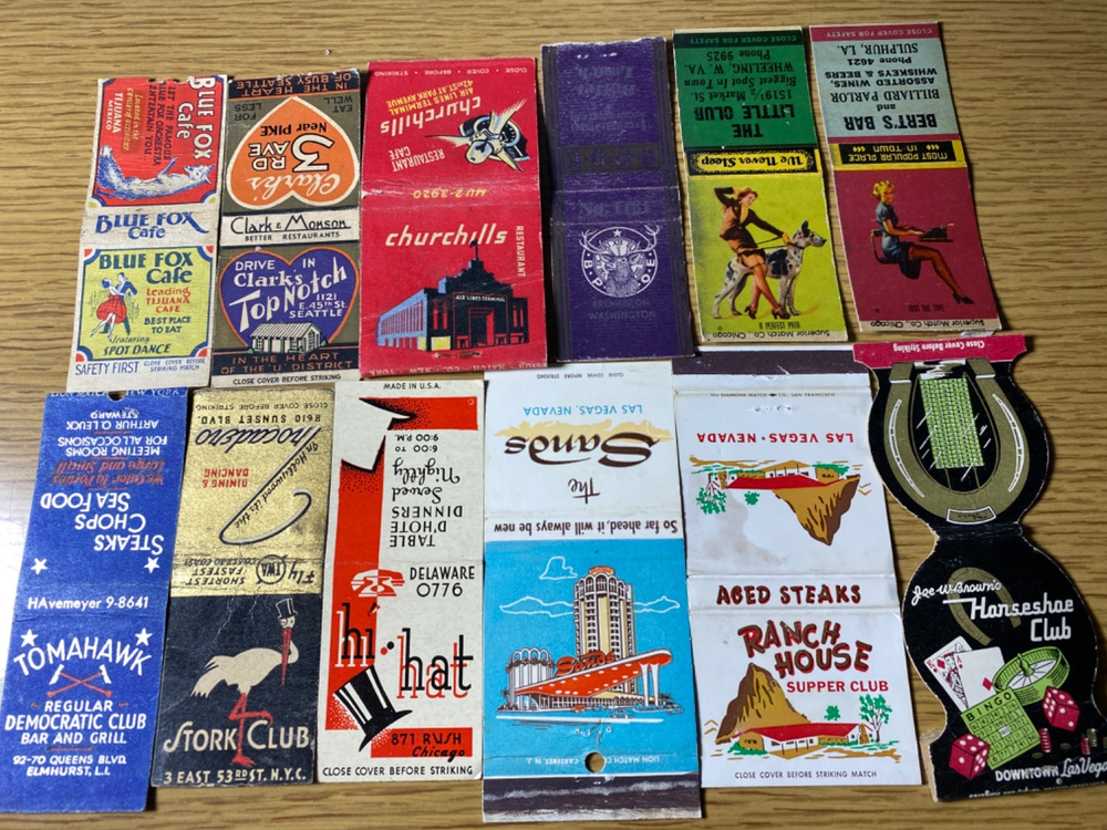 Huge collection of 417 Matchbook Covers Vintage advertising covers 1930s to 1950s • Restaurants and clubs • Automobiles, trains, airlines • Alcohol, colas, tobacco, food, candy • Sports, expositions, medical, military • Hotels, businesses, shaving, dog food, misc. Matchbook covers vary in size, very colorful, no matches included. Visit our store for 2,000+ items – Thank You!