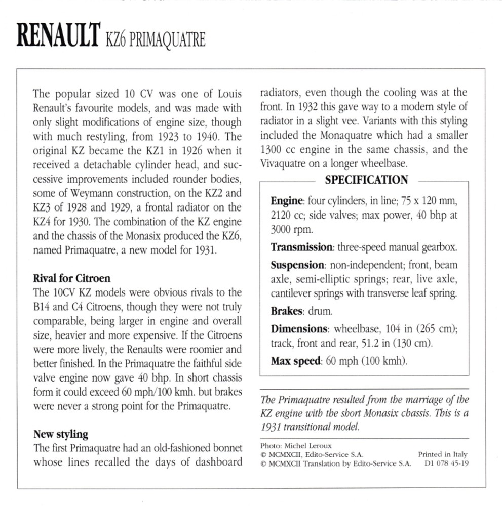 Collectors Club Classic Cars card. Renault KZ6 Primaquatre 1931-1932 Popular category. Each card provides information and specifications of the featured car. Very good condition. Any scanning defects on the images, such as vertical lines, are not present on the actual card. Postage can be combined for multiple purchases. Cards will be protected, and sent in stiff cardboard envelopes.