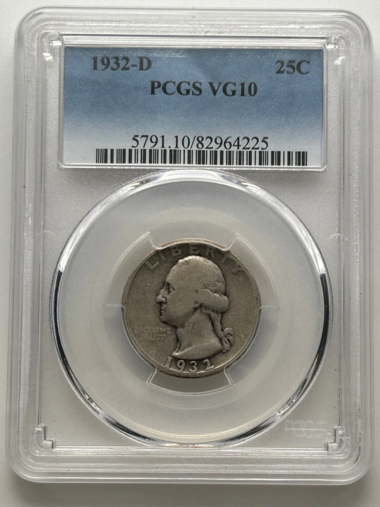 This 1932 D Washington Quarter is a highly sought-after coin with a PCGS VG10 grade. It features a striking business strike type and is composed of 0.9 fineness silver. The coin has a denomination of 25C and was minted in Denver, United States. This coin is a key date and comes from a PCGS population of 208. It is certified by PCGS and is a great addition to any coin collection. The coin is circulated and has a beautiful appearance. Don't miss out on the opportunity to add this rare and valuable coin to your collection.