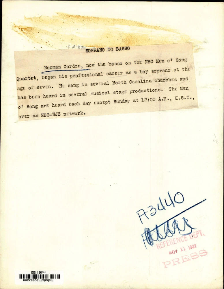 ebay template Note: Please study the images carefully to determine the condition of this vintage photograph, as it may not be in perfect condition. It may contain wrinkles, cracks, and possibly even tears due to its age and how it was handled before it got to us. A scanner may interpret colors and contrast differently than human eyes will, so it is possible that the actual photograph may be slightly darker or lighter in person. This vintage photograph is offered for sale as a collectible item and conveys no transfer of copyright. 1932 Press Photo Norman Cordon on the NBC Men o' Song Quartet - nei61100 Soprano to basso. Norman Cordon, now the basso on the NBC Men o' Song Quartet, began his professional career as a boy soprano at the age of seven. He sang in several North Carolina churches and has been heard in several musical stage productions. The Men o' Song are heard each day except Sunday at 12:00 a.m., EST, over an NBC-WJZ network. Photo measures 8 x 10.25 inches. Photo Is dated 1932. PHOTO FRONT PHOTO BACK Historic Images Part Number: nei61100 Sell Smarter with Kyozou. Inventory and Ecommerce Management