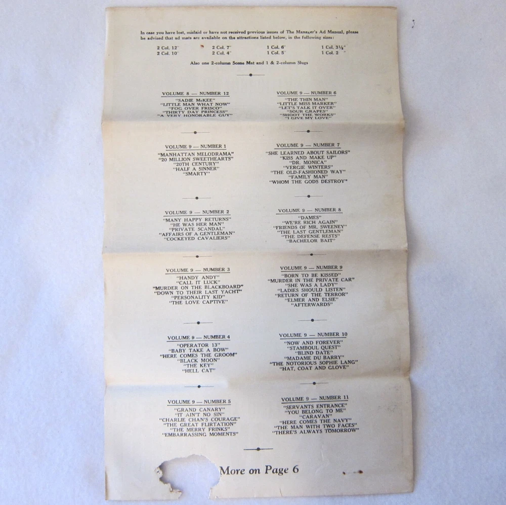 Wray Cagney Fields Lobby Aces 1934 Movie Original Lobby Poster Sampler 9x15 Movie: Various (see photos)The Old-Fashioned Way, Here Comes the Navy, et.al. Actors: WC Fields , James Cagney, Fay Wray, et.al. Studio: Various Measures: 9 x 15” Description: This TWO-SIDED advertising piece was sent out to local movie theatres by the publishing company, Metropolitan Engravers, Ltd., and features - on both sides - a selection of graphics for Lobby Advertising that theaters of the day could choose from. This sampler is printed on heavy newsprint in various shades of black, white, and grey. Condition: Damaged area at the top approximately 1¾" x 1¼" (see photo). With this 87+ year-old paper collectible, you can also expect nicks, possible insect damage, staple holes, rust stains from staples, age discoloration, staining or small tears. It has been folded into fourths so there are three gently rounded crease marks at approximately 4" intervals across its width. Please examine photos of this rare and fragile paper item carefully. Check out our other interesting items !