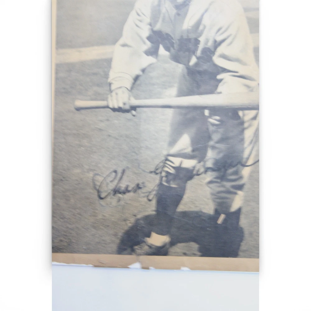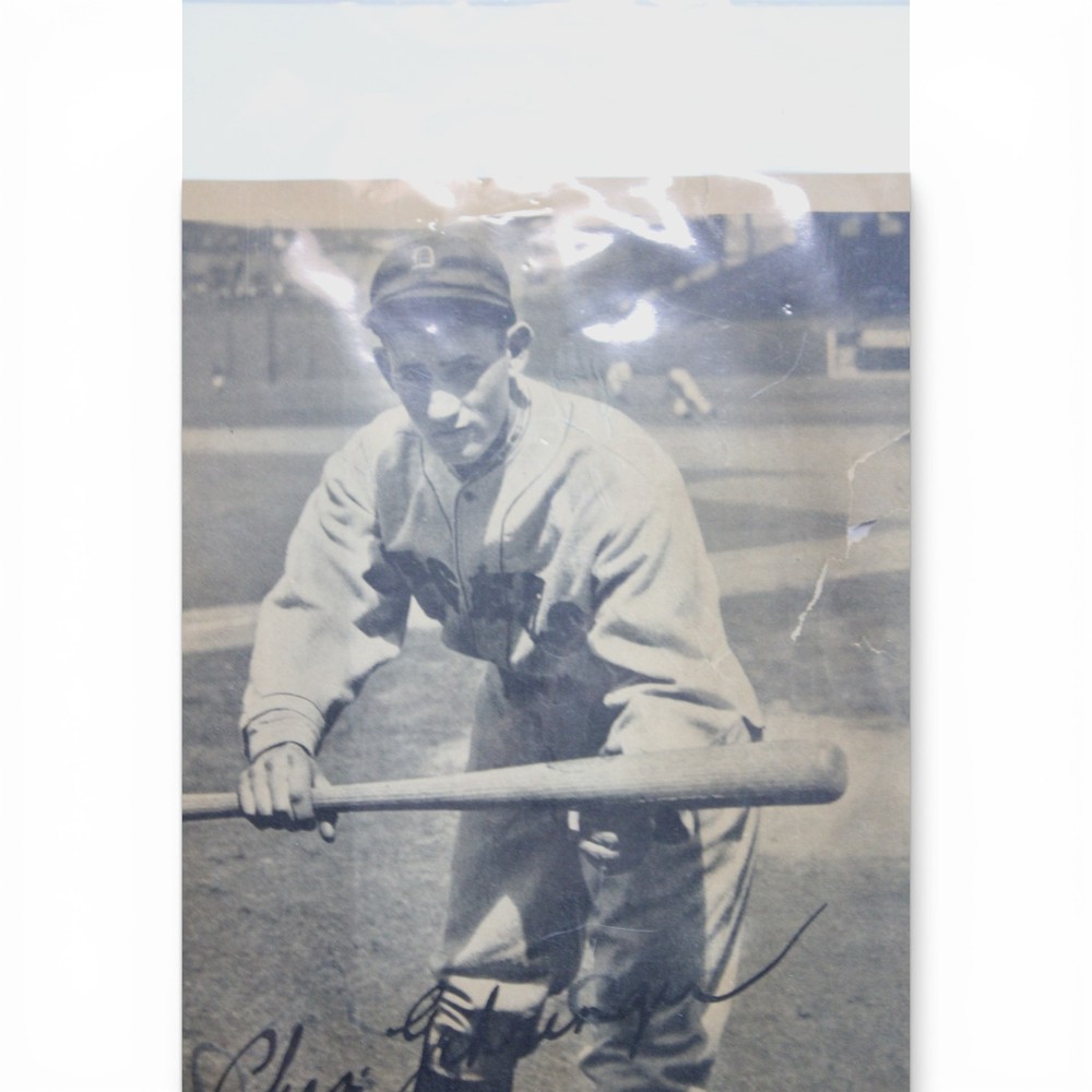 Original 1934 R310 Butterfinger premium featuring Hall of Famer Charlie Gehringer of the Detroit Tigers. This is the larger premium-style issue (not a standard trading card). The piece is closer to paper/photo size rather than traditional card dimensions. The image shows Gehringer in batting pose with the printed facsimile signature as part of the original design — this is NOT a hand-signed autograph. Details: • Year: 1934 • Issue: R310 Butterfinger Premium • Player: Charlie Gehringer • Team: Detroit Tigers • Type: Large format premium photo (not a standard card) • Printed facsimile signature Condition Notes: Shows significant age-related wear including creasing, edge tears, corner wear, surface wear, and areas of paper loss along the borders. Visible damage along the right edge and lower border. Please review all photos carefully for exact condition. Scarce pre-war Butterfinger premium featuring Hall of Fame second baseman Charlie Gehringer. Desirable piece for advanced vintage baseball and Detroit Tigers collectors.