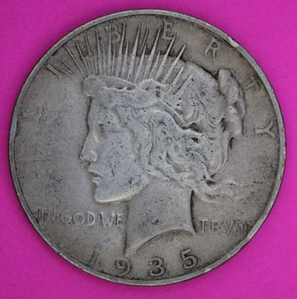 Strike Type: Business Coin: Peace silver Dollar Composition: Silver Certification Number: Uncertified Brand: US Mint Certification: Uncertified Precious Metal Content per Unit: 24 grams Total Precious Metal Content: 24 grams Year: 1935 Grade: Ungraded Brand/Mint: US Mint Fineness: 0.900