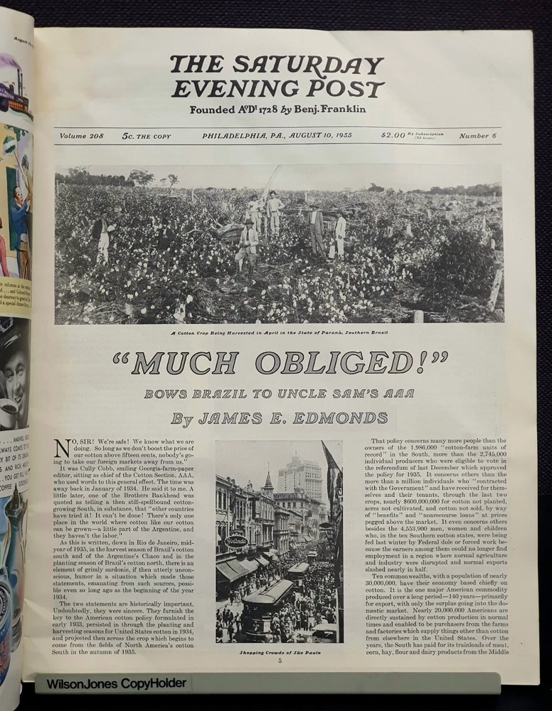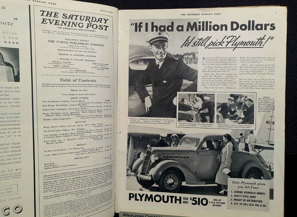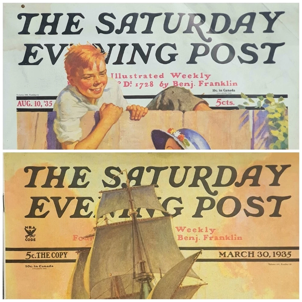 Both issues are in Very Good Plus condition with no loose or missing pages. The March 30, 1935 issue of The Saturday Evening Post features a cover illustration titled “Spanish Galleon” by Anton Otto Fischer. This issue has 107 numbered pages. The August 10, 1935 issue of The Saturday Evening Post features a cover titled “Marge loves David,” created by artist George Brehm. This issue has 84 numbered pages. The Saturday Evening Post is an American magazine, currently published six times a year. It was published weekly from 1897 until 1963, and then every other week until 1969. From the 1920s to the 1960s, it was one of the most widely circulated and influential magazines among the American middle class, with fiction, non-fiction, cartoons and features that reached two million homes every week. The Saturday Evening Post was first published in 1821 in the same printing shop at 53 Market Street in Philadelphia, where the Benjamin Franklin-founded Pennsylvania Gazette was published in the 18th century. While the Gazette ceased publication in 1800, ten years after Franklin's death, the Post links its history to the original magazine. Cyrus H. K. Curtis, publisher of the Ladies' Home Journal, bought the Post for $1,000 in 1897. Under the ownership of the Curtis Publishing Company, the Post grew to become the most widely circulated weekly magazine in the United States.