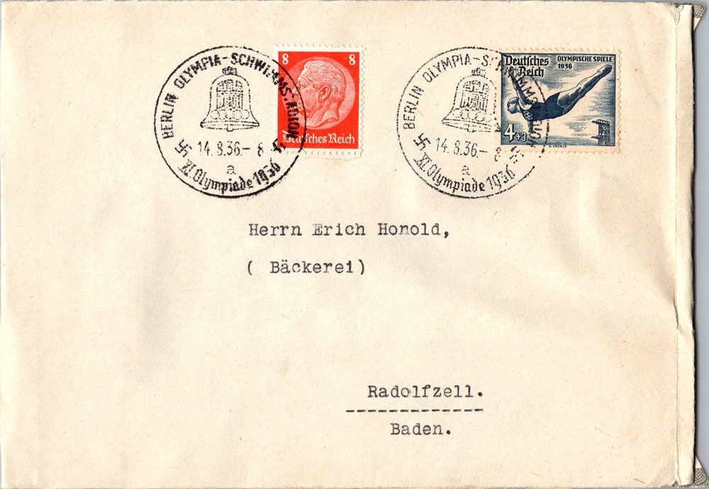 Up for auction is a beautiful postcard cover from Germany. In excellent condition . Priced to sell. Great stamps and cancels. 1936 Berlin Germany Olympic Bell Stamp Envolope Cover To Baden World War II Postmarked August 14, 1936