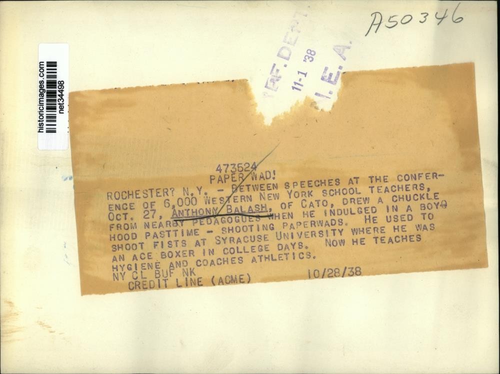 ebay template Note: Please study the images carefully to determine the condition of this vintage photograph, as it may not be in perfect condition. It may contain wrinkles, cracks, and possibly even tears due to its age and how it was handled before it got to us. A scanner may interpret colors and contrast differently than human eyes will, so it is possible that the actual photograph may be slightly darker or lighter in person. This vintage photograph is offered for sale as a collectible item and conveys no transfer of copyright. 1938 Press Photo Anthony Balash shoots paper wads at NY Teachers School This is an original press photo. Photo measures 6 x 8.25inches. Photo is dated 10-28-1938. PHOTO FRONT PHOTO BACK Historic Images Part Number: net34498 Sell Smarter with Kyozou. Inventory and Ecommerce Management