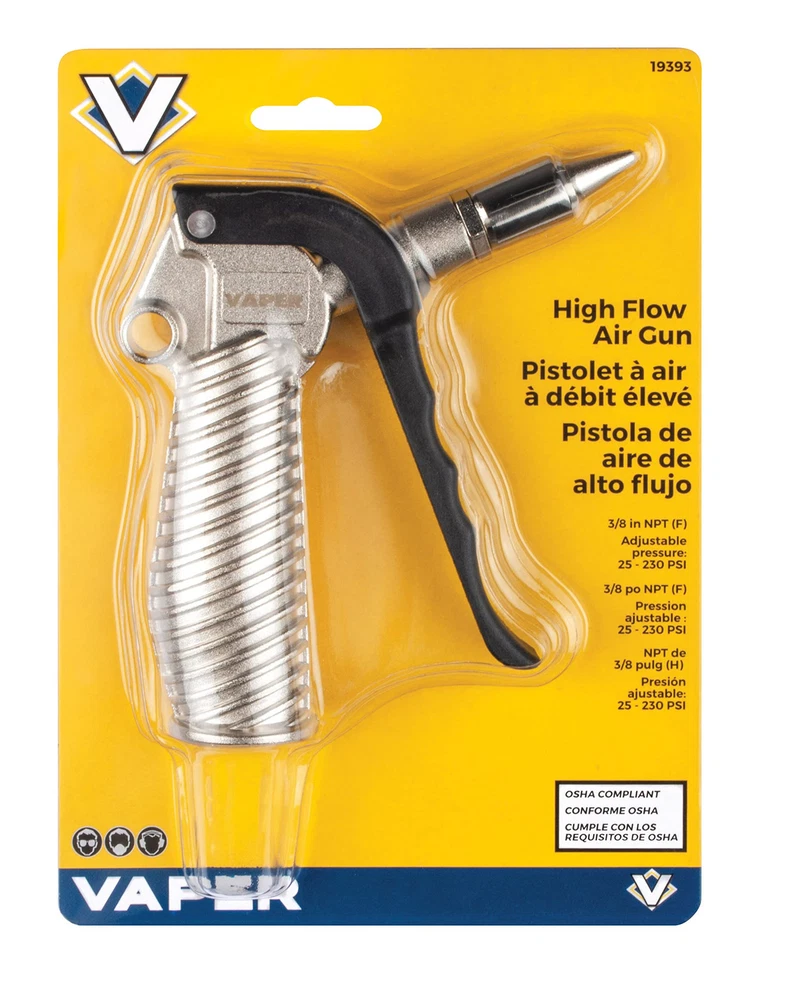’s aluminum air blow is designed with 3/8-Inch air intake thread. When used with thread sealant tape, this high-volume air allows for greater air flow and higher PSI with adjustable pressure between 25 -230 PSI. The tapered high-flow tip can be directed towards hard-to-reach areas. Designed with a unique non-slip-aluminum ergonomic handle, this sturdy air blow MEETS OSHA STANDARDS: OSHA 1910.95 for noise levels and standard OSHA 1910.242B for dead-end pressure. Patented in Taiwan and the USA. Aluminum air blow is designed with 3/8-Inch air intake thread and a unique non-slip aluminum ergonomic handle When used with thread sealant tape, this high-volume air allows for greater air flow and higher PSI with adjustable pressure between 25-230 PSI Tapered high-flow tip can be directed towards hard-to-reach areas Includes: 1/4-Inch Series Plug with 3/8-Inch NPT Male Thread with pre-applied thread sealant MEETS OSHA STANDARDS: meets OSHA standard 1910.95 for noise levels and standard 1910.242B for dead-end pressure