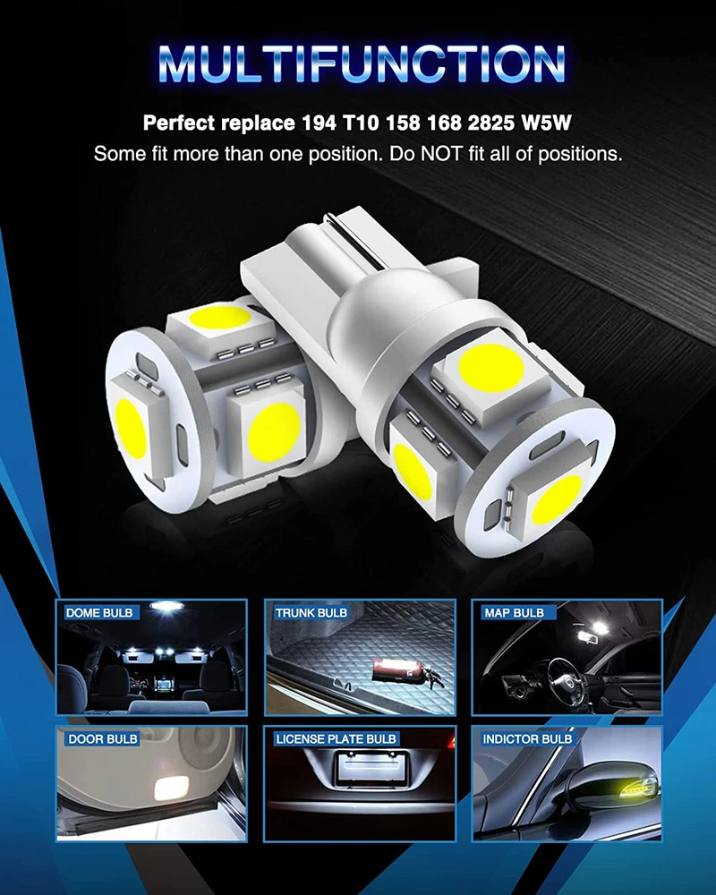 Neighborhood service 194 LED Bulb 6000K White 168 T10 2825 W5W 5SMD Replacement Bulbs for Car Dome Map Door Courtesy Side Marker Reading Glove Box License Plate Lights (Pack of 10) ENJOY THE FEATURES Fit bulb size: T10, 147, 152, 158, 159, 161, 168, 175, 184, 192, 193, 194, 2825, W5W, 194 LED bulb can fit map light, dome light, license plate light, trunk light, courtesy light, side marker light, interior door light, parking light Notice: 194 led bulbs could fit most of positions of car, do not fit all positions of your car, according to the year and model of your car, please double check owner's manual, for 12V vehicle Better beam pattern: each bulb has 5 pcs high power SMD led, color temperature: 6000K(xenon white), voltage: 12V No polarity no flip: it is truly no polarity, can light on two sides, no need more modification or flip, plug and play, easy install within 5 minutes Tips: 10 packs of 194 led bulbs of one set, for some vehicles, It may need a canbus decoder to fix flickering or error code Product Description 1 BRIGHTER BULBS 2 LONGER LIFESPAN 3 EASIER TO INSTALL What is the cross reference number for this product? This product will fit OEM bulb's part number: 194 168 2825 W5W T10 175 etc. How many bulbs included per order? Yes, it includes 10pcs 194 LED bulbs per order; Color will be based on your selection. Can I find the correct products for my vehicle directly on Amazon? Sure, Amazon has fitment Guide shows like amazonconfirmedFit | Make sure this fits. Please follow the instructions and checked the Notes and Position to see whether it meets your need. How to contact with seller if there are any issues with bulbs? Clicking "listing Page" --> Product Description-->Product guides and documents--> Clicking“User Guide (PDF)” --> Contact the "Marsauto Support Team" via the Brand email, usually you'll receive a reply within 24 hrs. What is the return policy? Hassel free return for 30 days since purchase date. Marsauto 2024 New Series LED Light Bulbs Add to Cart Add to Cart Add to Cart Add to Cart Add to Cart Add to Cart Add to Cart Customer Reviews 4.5 out of 5 stars 49,458 4.5 out of 5 stars 5,179 4.2 out of 5 stars 16 4.2 out of 5 stars 35 4.6 out of 5 stars 92 4.1 out of 5 stars 84 4.6 out of 5 stars 92 Price $11.09 $ 11 . 09 $13.99 $ 13 . 99 $16.99 $ 16 . 99 $19.99 $ 19 . 99 $18.99 $ 18 . 99 $19.99 $ 19 . 99 $19.99 $ 19 . 99 Pcs per Pack 10 pcs 4 pcs 2 pcs 2 pcs 2 pcs 2 pcs 2 pcs Color White White White White White White White Chip Model 3030-SMD 3030-SMD 2835-SMD 2835-SMD 2835-SMD 3030-SMD 3030-SMD Lumens 1500 LM 1500 LM 2000 LM 2000 LM 2000 LM 2000 LM 2000 LM No polarity ✔ ✔ ✔ ✔ ✔ ✔ ✔ Item model number T10 Item Package Quantity 1 Style 194 Light Source Type LED Color Temperature 6000 Kelvin Color Xenon White Mirror Lighting Type automotive-interior-dome-light-bulbs, automotive-exterior-combination-parking-and-side-marker-light-bulbs,Automotive-exterior-turn-signal-light-bulbs, Automotive-exterior-back-up-light-bulbs,Automotive-interior-dome-light-bulbs, automotive-exterior-license-plate-light-bulbs Product Dimensions 5 x 5 x 14 inches Wattage 5 watts Fit Type Vehicle Specific Fit Country of Origin China Manufacturer Part Number AT10-10P-W Specific Uses For Product function(f) {var _np=(window.P._namespace("DetailPageProductOverviewTemplatesJava"));if(_np.guardFatal){_np.guardFatal(f)(_np);}else{f(_np);}}(function(P) { P.when('A').execute(function(A){ A.on('a:truncate:po-attribute-truncate-1:updated', function(data) { var isTruncated = !data.truncateInstance.getIfTextFits(); var seeMoreElement = document.getElementById('po-attribute-see-more-id-1'); if(seeMoreElement) { seeMoreElement.style.display = isTruncated ? '' : 'none'; } }) }); })); map light, dome light, license plate light, trunk light, courtesy light, side marker light, parking light, interior door light, reading lights, glove box lights, inner tail light bulb, etc See more Item Weight 0.64 ounces Voltage 12 Volts Exterior Polished Auto Part Position Rear Model 194 T10 168 Is Discontinued By Manufacturer No 5.0 inches x 5.0 inches x 14.0 inches. Weight: 0.64 oz PAYMENT We accept all payments via Ebay using Credit Cards , PAYPAL , Apple Pay and many others SHIPPING We are always working hard to ensure your package arrives as soon as possible. Please understand that some factors like weather, high postal traffic, and the performance of shipping companies are outside of our control. We offer free shipping to the lower 48 states and ship within 3-5 business days of payment, usually sooner. We do not accept P.O. Boxes. Please provide a physical address. We do not ship internationally at this time. DELIVERY & RETURN POLICY We do not offer returns unless the item violates eBay policies. Please be aware these polices only make sellers accept returns if the item violates eBay's Buyer Guarantee. If you would like to learn more about this please visit eBay's Help Page. Thank you for your business