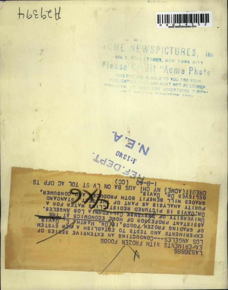ebay template Note: Please study the images carefully to determine the condition of this vintage photograph, as it may not be in perfect condition. It may contain wrinkles, cracks, and possibly even tears due to its age and how it was handled before it got to us. A scanner may interpret colors and contrast differently than human eyes will, so it is possible that the actual photograph may be slightly darker or lighter in person. This vintage photograph is offered for sale as a collectible item and conveys no transfer of copyright. 1940 Media Photo Dr Martha E Davis conducting experiments in California This is an original media photo. Assistant Professor of Home Economics at the University of California, Dr. Martha E. Davis redistilling water as part of tests to establish a new system of grading frozen food.Photo measures 7 x 9inches. Photo is dated 1-8 PHOTO FRONT PHOTO BACK Historic Images Part Number: ned14552 Sell Smarter with Kyozou. Inventory and Ecommerce Management