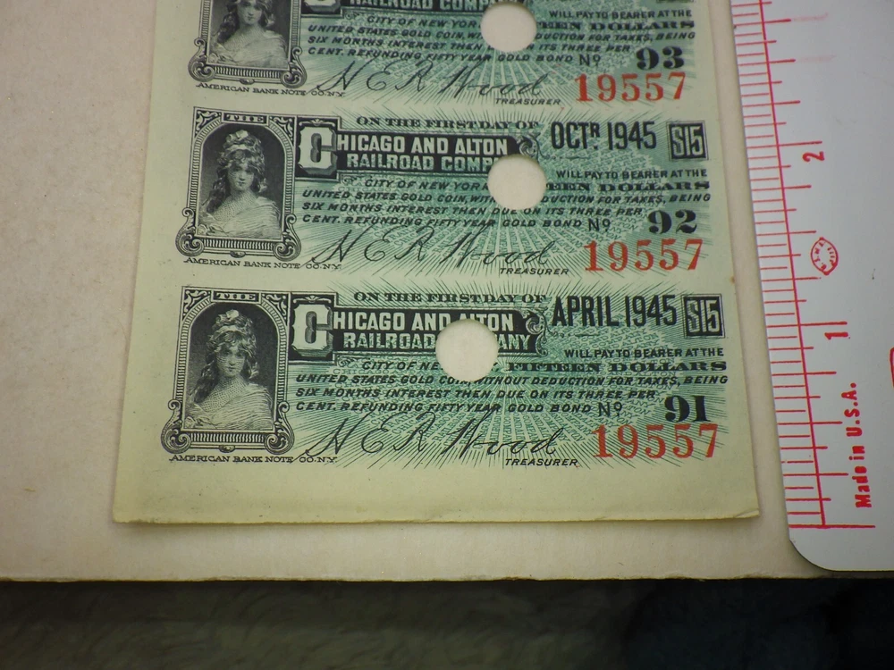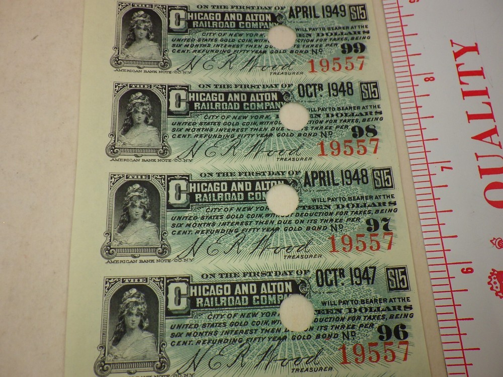 1940s Chicago Alton Railroad Train Company Coupon Bond Stock Vintage Shipped Flat, Poly sealed, and with a backing such as cardstock, cardboard, or similar, to help prevent bending. Ruler(s) not included in the sale. *Please see the photos for the condition and more details. Writing on item packages such as pricing or condition is most likely old and out of date, so please ignore it. Does not include the photo board used to take photos of coins, you get just the coins. *Any weights or measurements are approximate -Shipping for this item will not automatically combine with other items, but we will refund it back to you when applicable.
