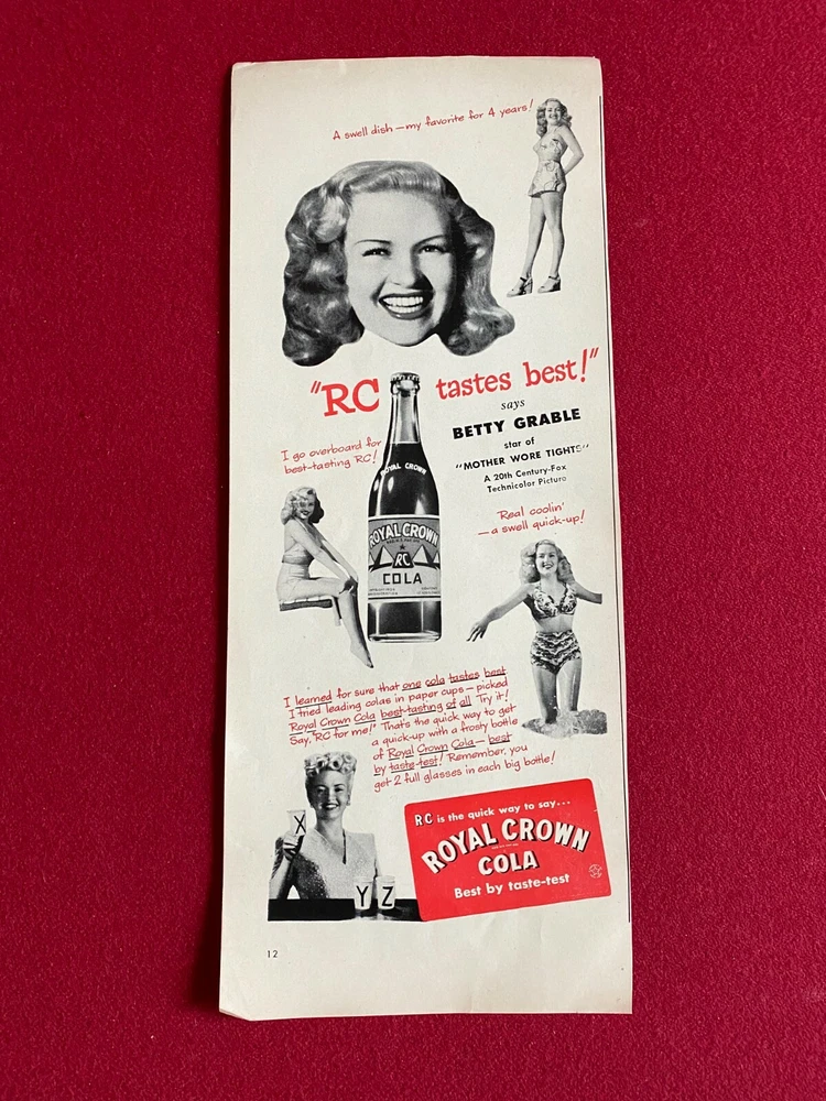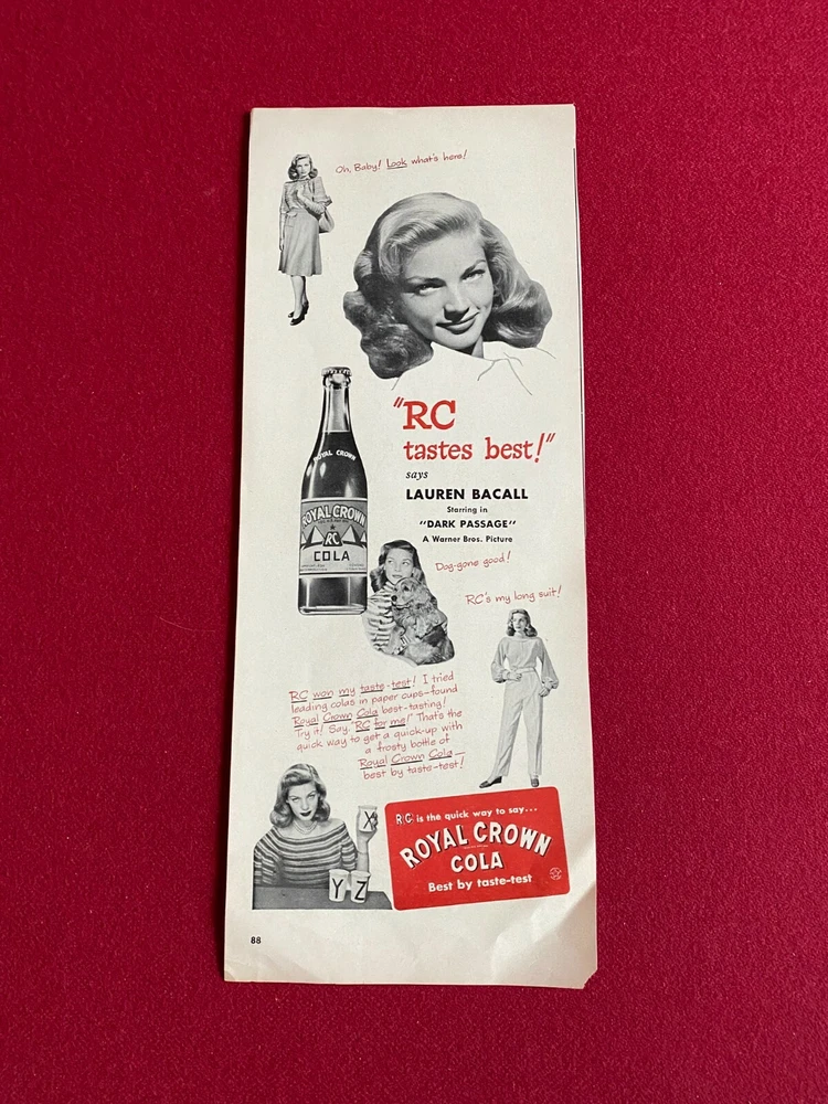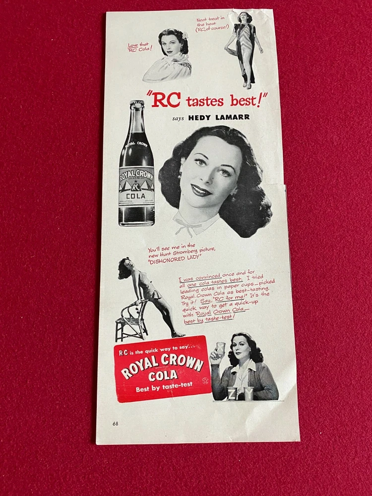 1940's , ROYAL CROWN ( RC ) COLA, (8) Different Magazine Advertisements featuring Legendary Hollywood Actresses, Scarce . Nice Condition. Very Cool RC Cola Collectibles!! Featuring: LAUREN BACALL BETTY GRABLE HEDY LAMARR LORETTA YOUNG SONJA HENIE MARJORIE REYNOLDS MARIA MONTEZ LYNN BARI